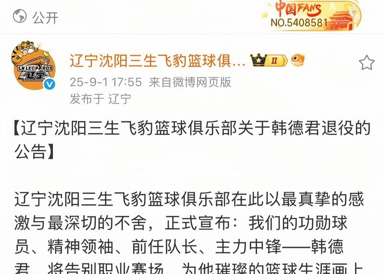 辽宁男篮官宣,队内功勋老将韩德君正式从职业赛场退役。 曾经赫赫有名的CBA“功夫熊猫”韩德君今年38岁,18年的职业生涯,4次CBA总冠军经历,2次全运会冠军经历,以扎实篮下技术、敬业精神著称! 他效力辽宁男篮18年,辽宁男篮拿下4次总冠军的核心功臣,但是随着年龄的增长,上赛季半决赛场均只能贡献3分3.5个篮板的技术。今年,辽宁男篮启动球员年轻化,更是加速了他退役的时间,岁月不饶人,竞技体育就是这么残酷。愿他退役后一切顺利! #韩德君退役# #韩德君# #辽宁男篮#