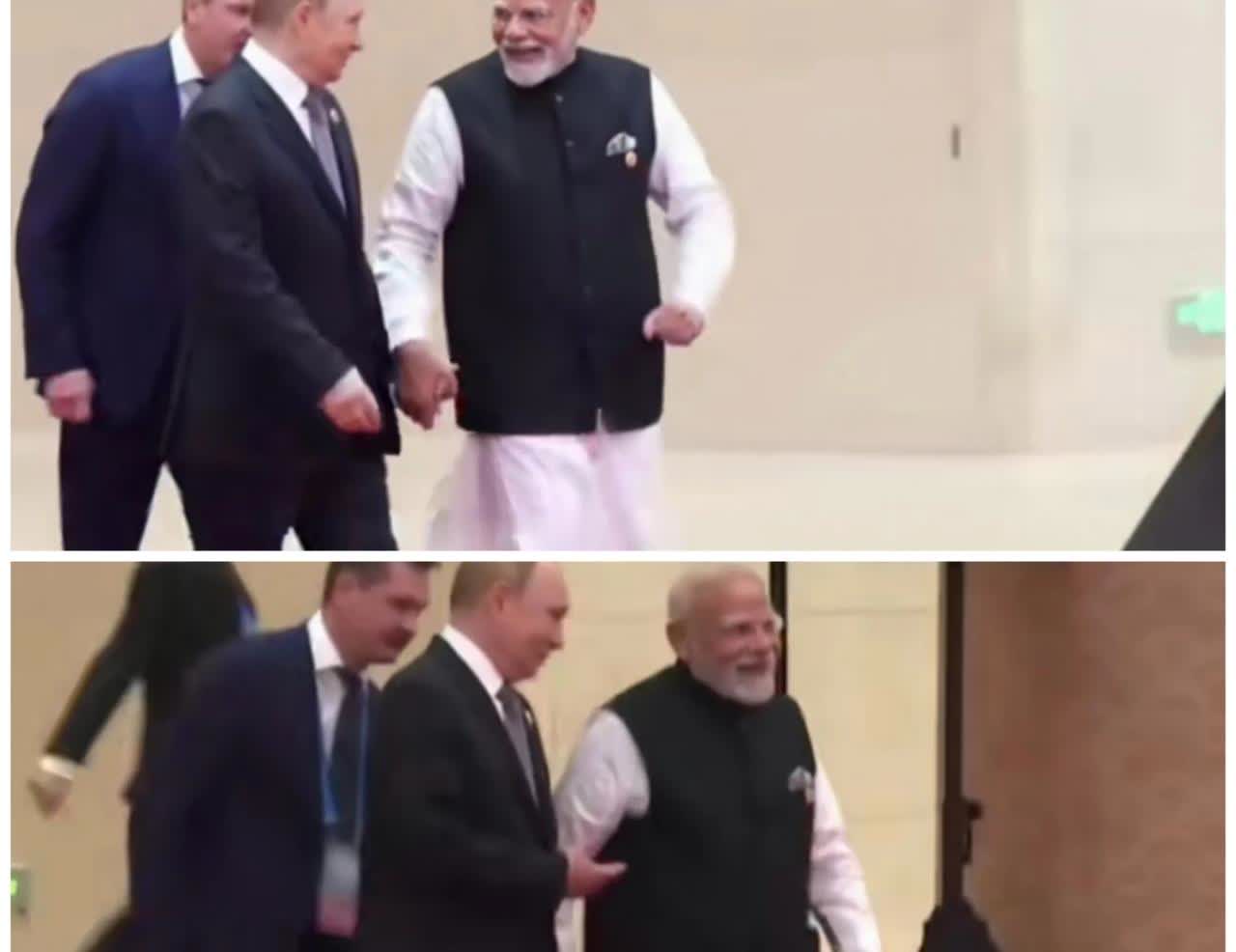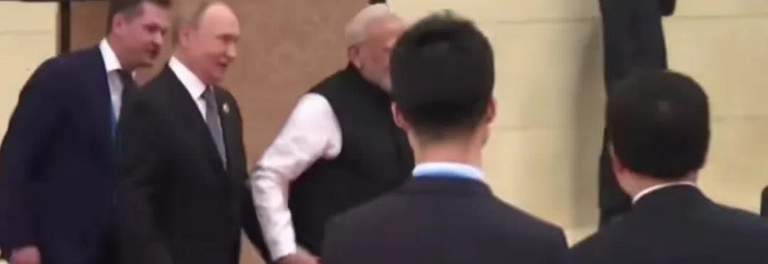 俄罗斯普京和莫迪在“天津峰会”上手拉手边走边聊满脸笑容。