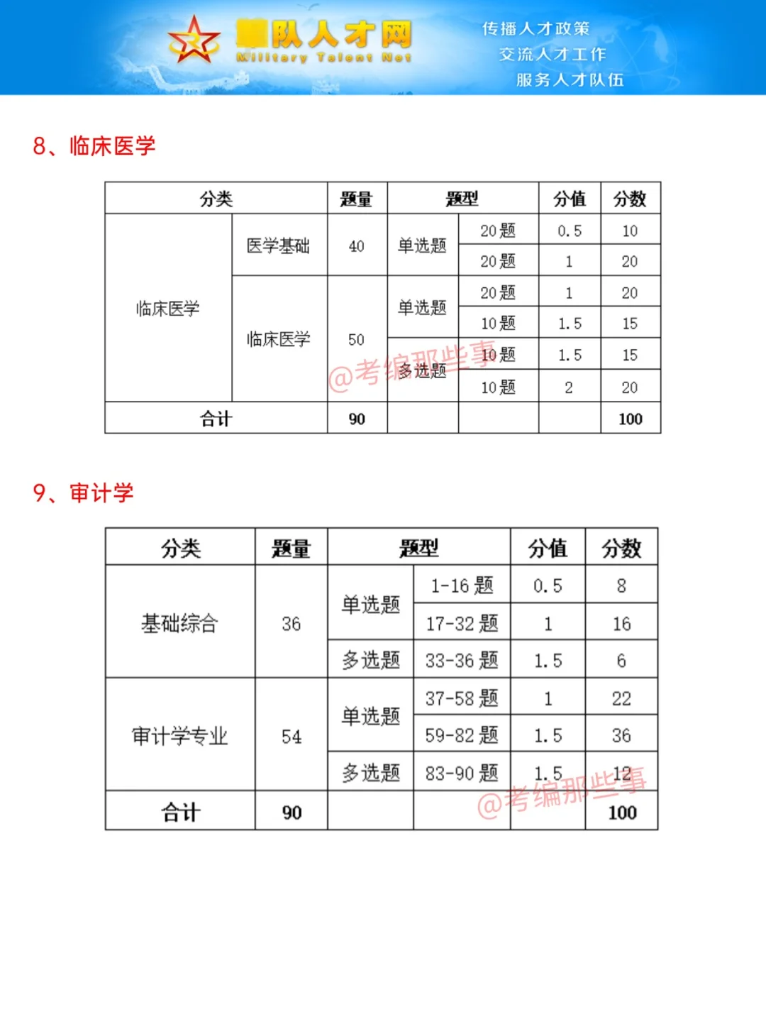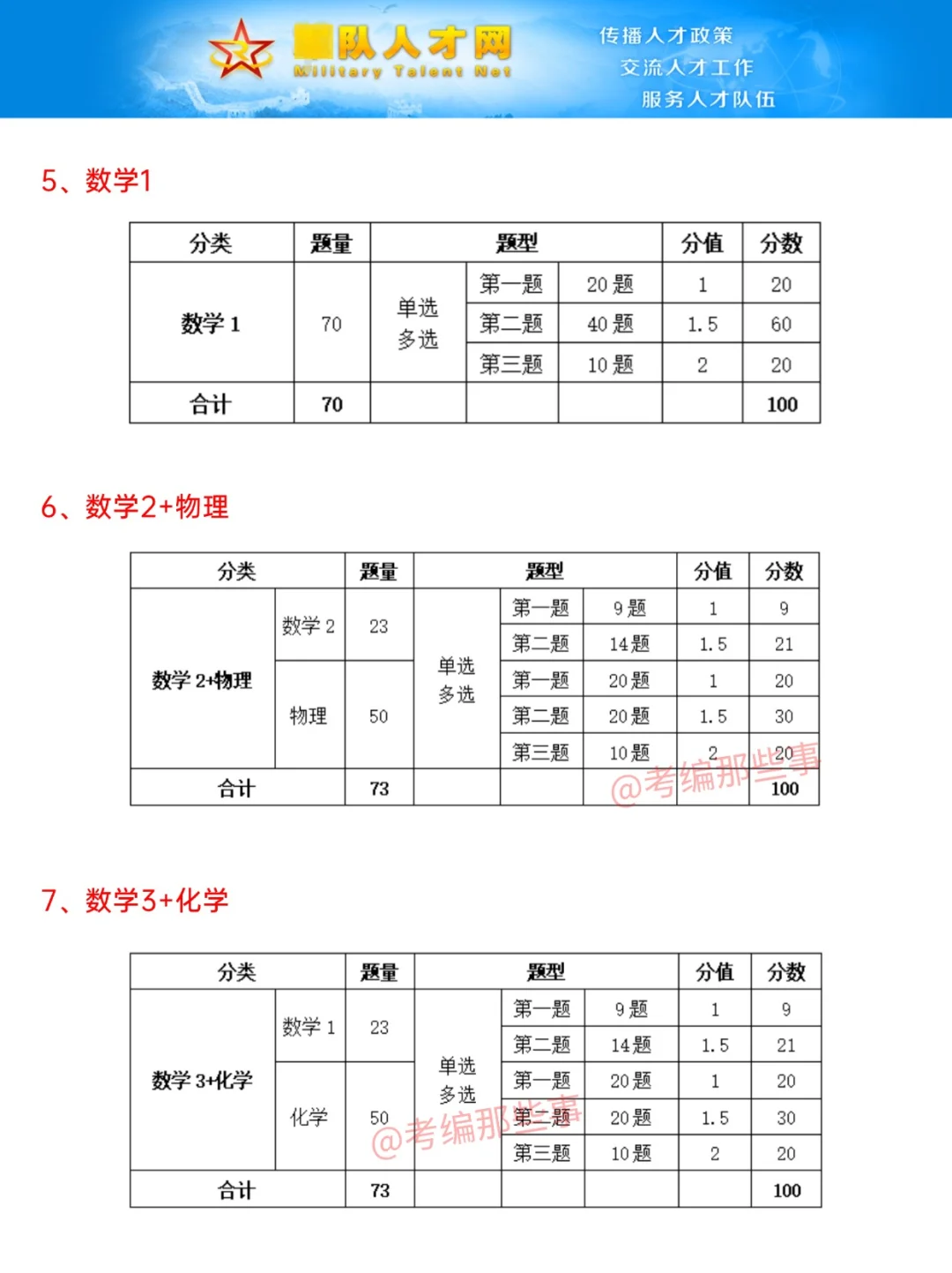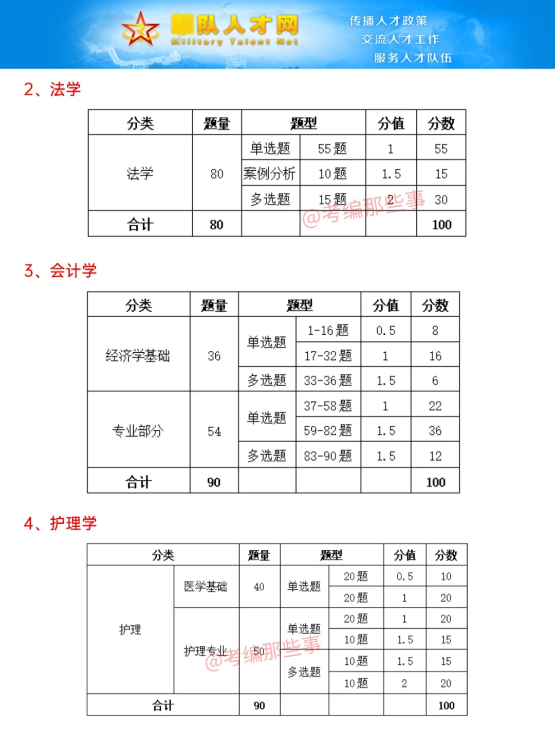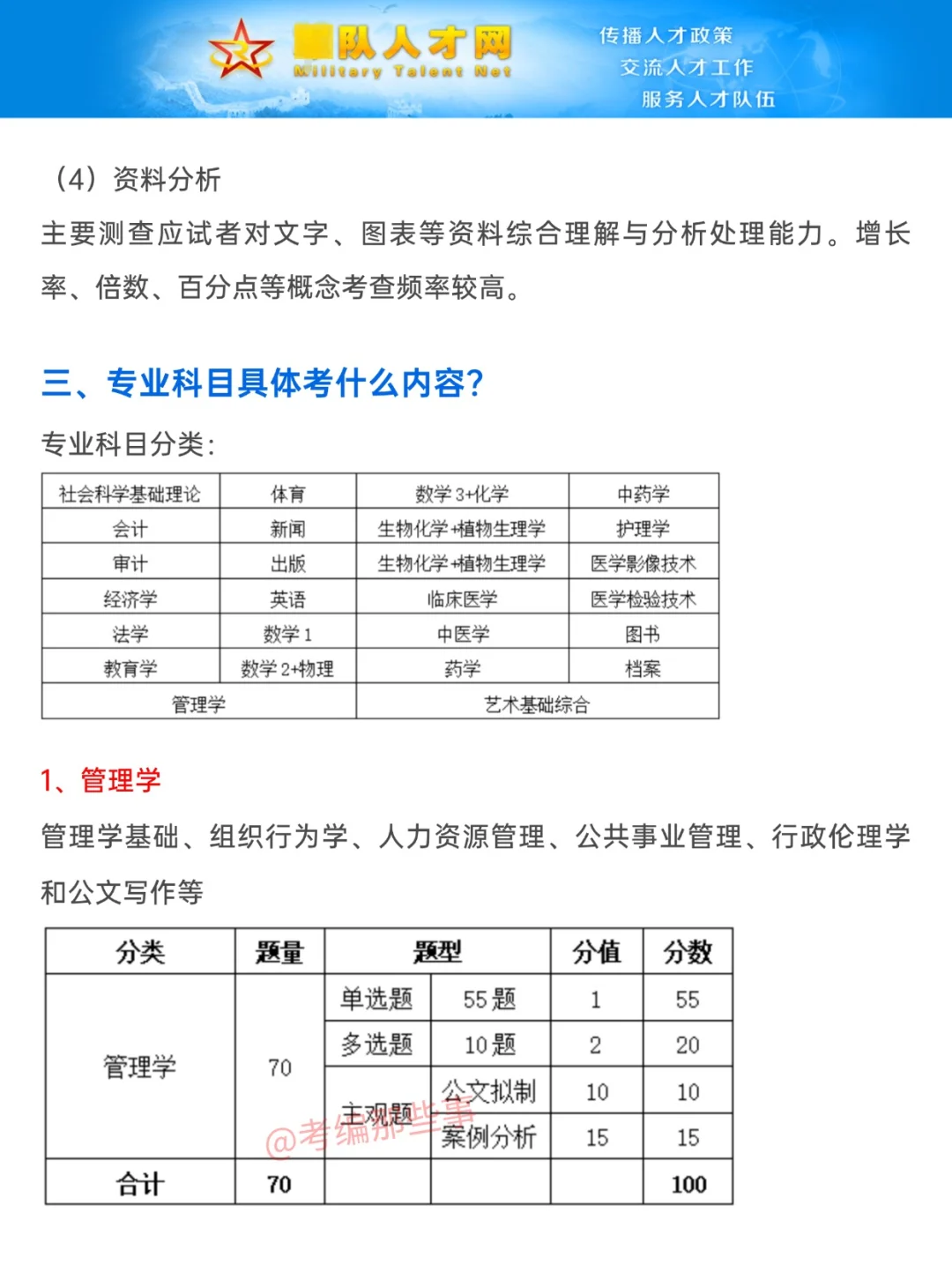 一、笔试科目 文职管理岗技术岗笔试科目分为公共科目和专业科目 公共科目= 基本知识(公基) + 岗位能力(行测) 专业科目有26种 . 二、公共科目具体考什么?分值分布? 公共科目共110题(参考2024) 1、基本知识 分单选题和多选题。 单选50题(每题0.5分)、多选10题(每题1.5分) 考察内容为...主义理论、人文与社会、国 F和 jun队、时事zheng治 2、岗位能力 言语理解与表达15题(每题1分)、数量关系10题(每题1.5分)、判断推理10题(每题1.5分)、资料分析15题(每题1分) . 三、专业科目具体考什么内容?分值分布? 1、管理学 共70题,分单选题、多选题、主观题。 单选55题(每题1分)、多选10题(每题2分)、主观题(公文拟制10分、案例分析15分) 2、法学 共80题,分单选题、多选题、案例分析。 单选55题(每题1分)、多选15题(每题2分)、案例分析10题(每题1.5分)。 3、会计学 共90题,分单选题、多选题。 4、护理学 共90题,分单选题、多选题。 医学基础:单选40题 护理专业知识:单选30题、多选20题 5、数学1 共70题,分单选题、多选题。 6、数学2+物理 共73题,分单选题、多选题。数学2有23题、物理有50题 7、数学3+化学 共73题,分单选题、多选题。数学1有23题、化学有50题