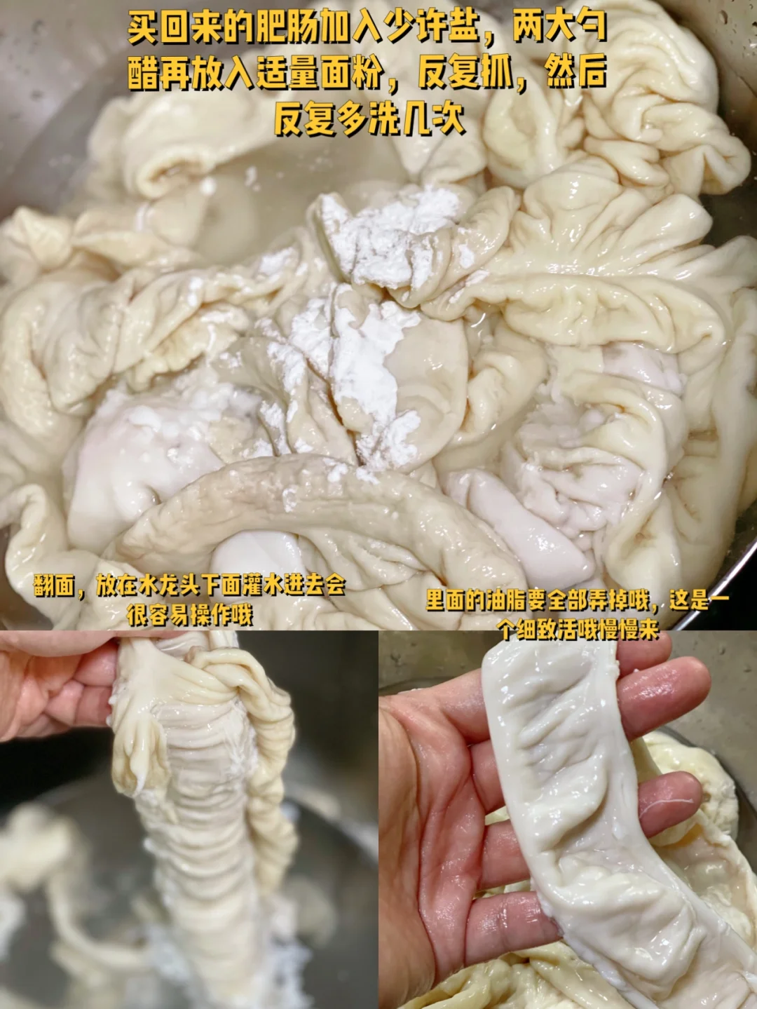 1.买回来的肥肠加入少许盐,两大勺醋再放入适量面粉,反复抓,然后反复多洗几次