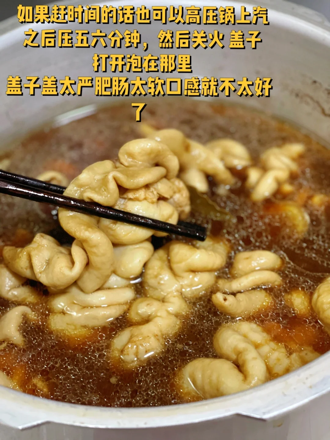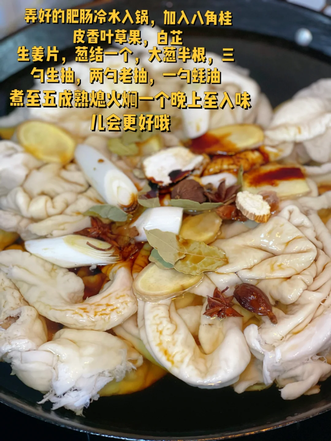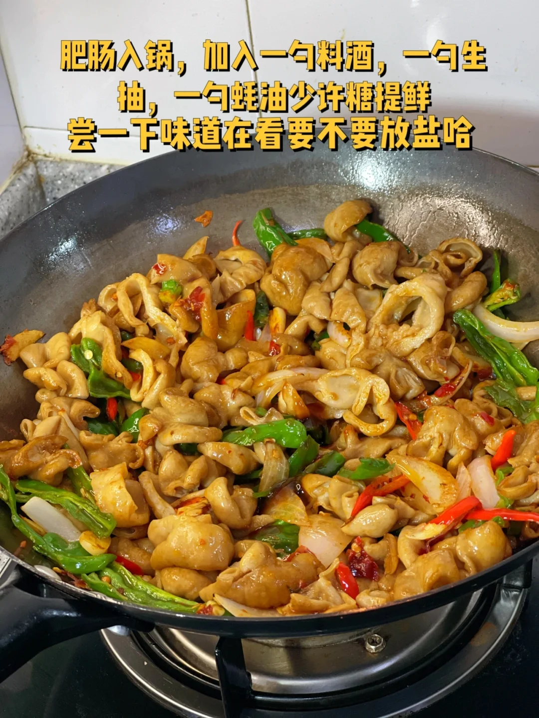 11. 肥肠入锅,加入一勺料酒,一勺生抽,一勺蚝油少许糖提鲜