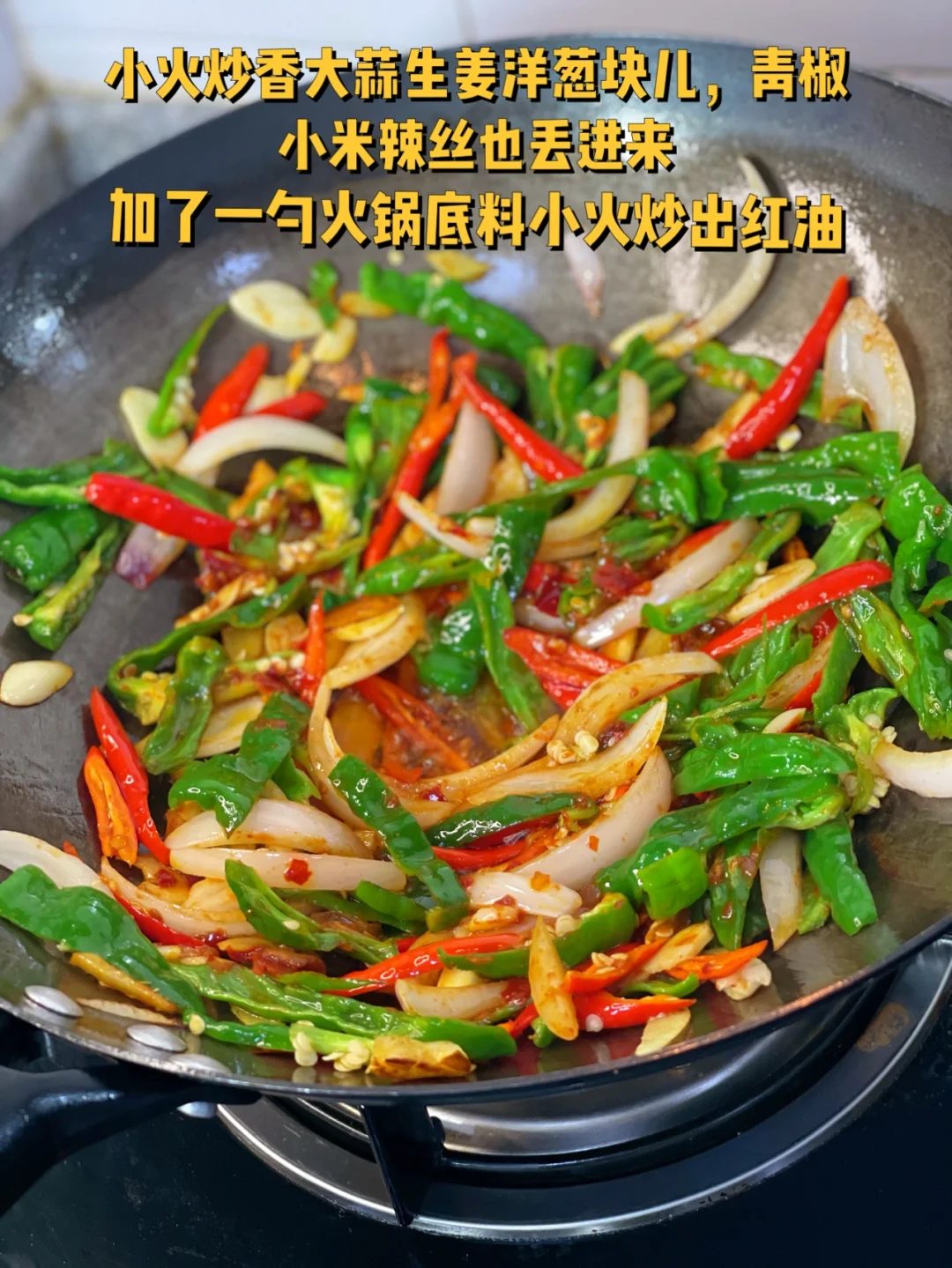 10. 小火炒香大蒜生姜洋葱块儿,青椒小米辣丝也丢进来,加了一勺火锅底料小火炒出红油