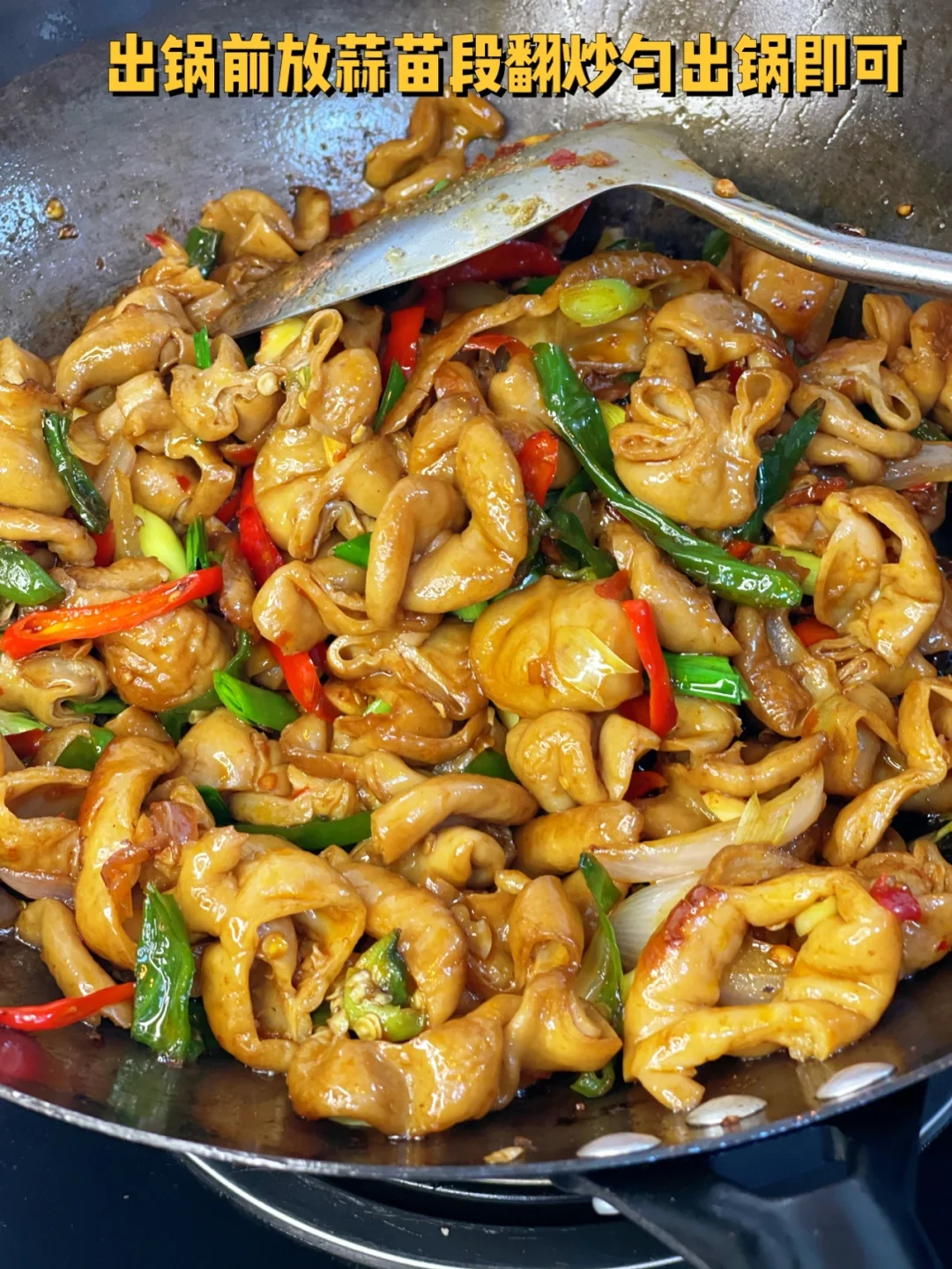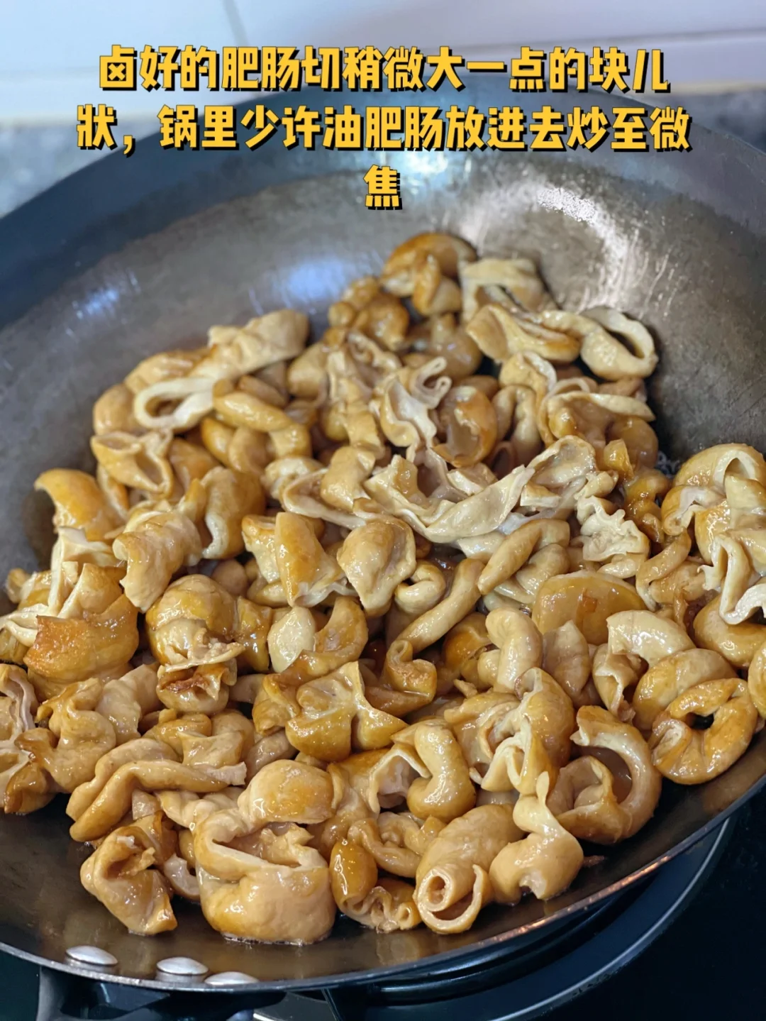 9. 卤好的肥肠切稍微大一点的块儿状,锅里少许油肥肠放进去炒至微焦