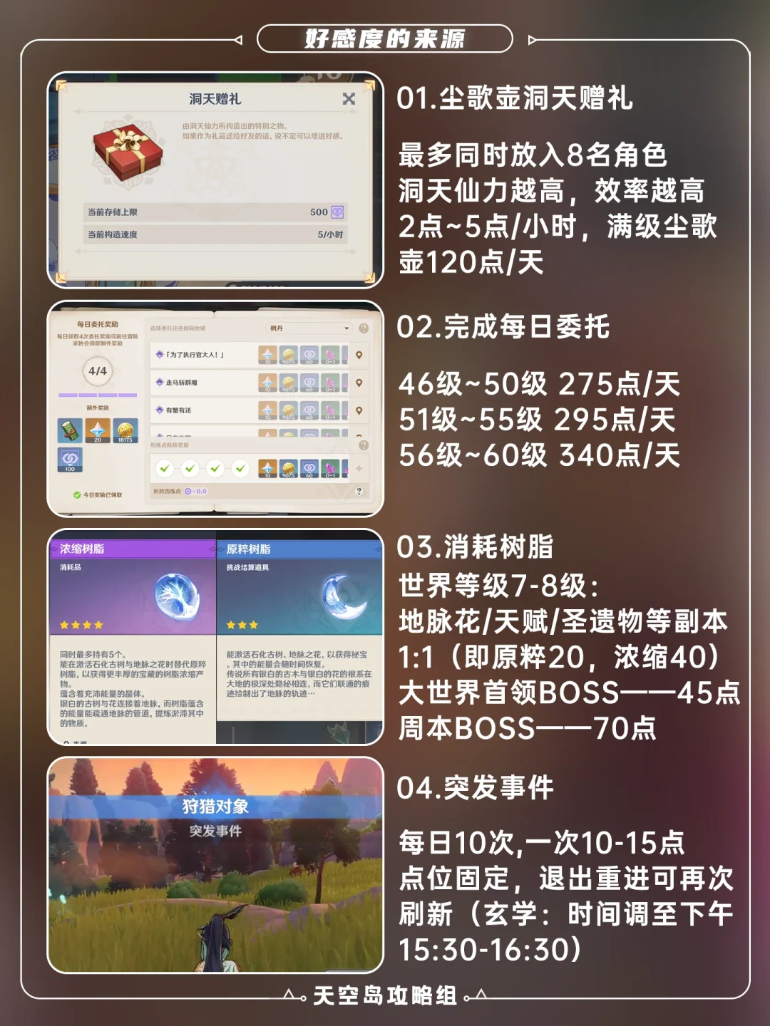 1⃣️好感度可通过尘歌壶洞天赠礼、完成每日委托、消耗树脂、突发事件获得