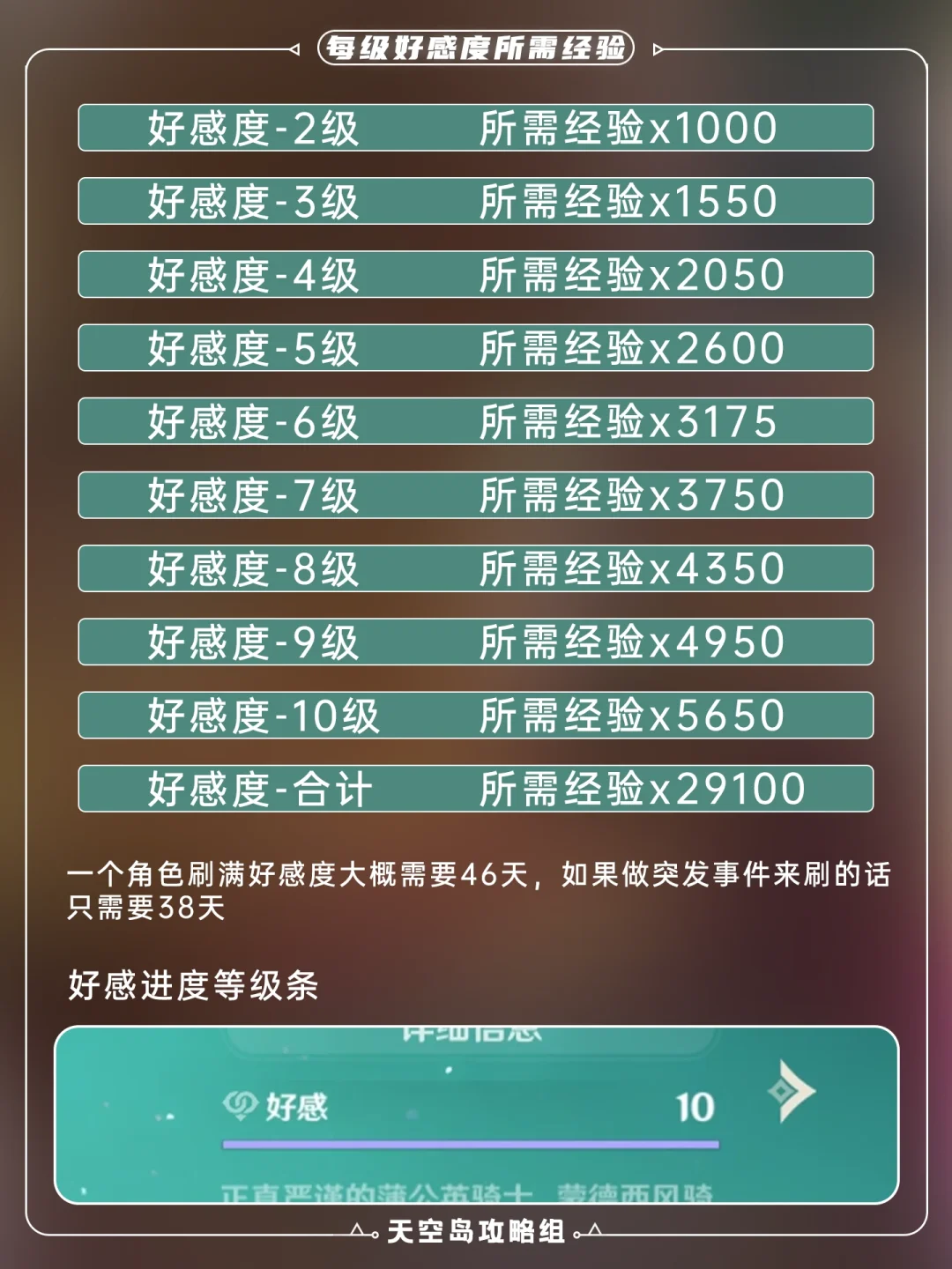 2⃣️一个角色刷满好感度大概需要46天,如果做突发事件来刷的话只需要38天