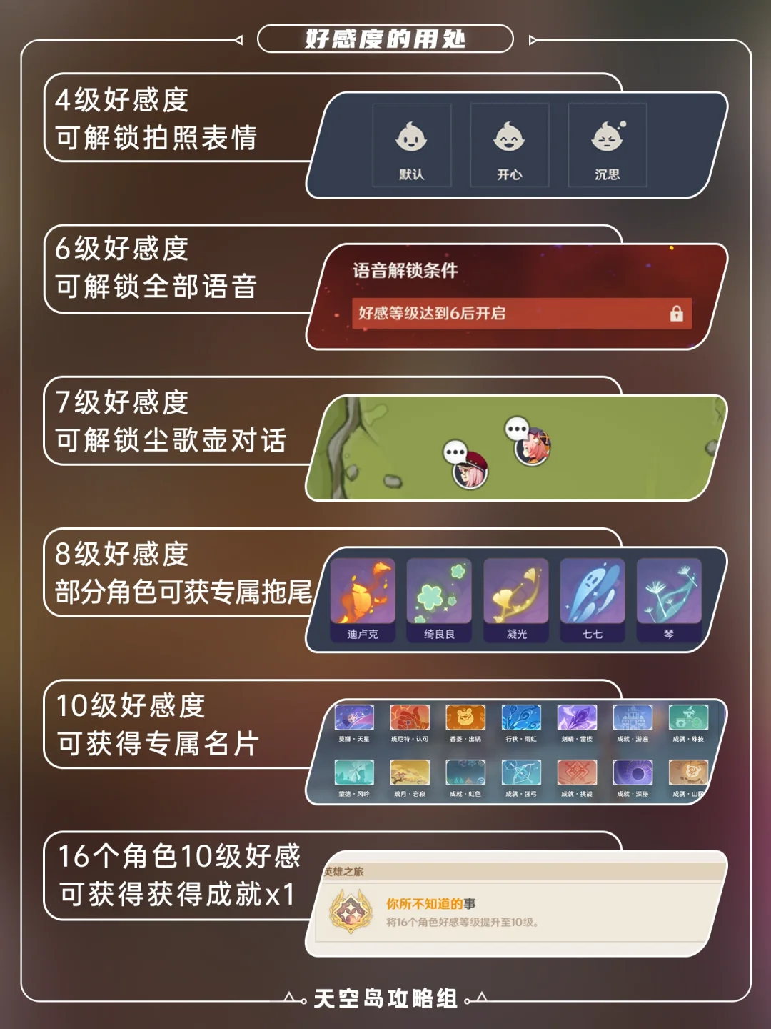 3⃣️不同的好感度等级可解锁拍照表情、全部语音、尘歌壶对话、部分角色可获专属拖尾、专属名片、获得成就!