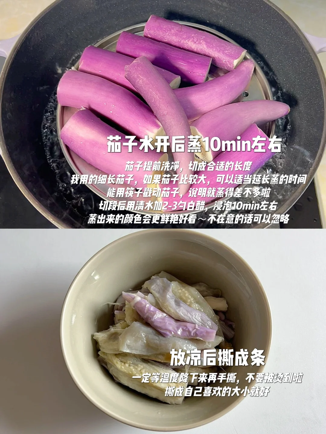 1⃣️ 茄子洗净切段,水开后蒸10-15min,放凉撕成条备用(如果茄子比较大,可以适当延长蒸的时间,能用筷子戳动茄子就差不多啦);