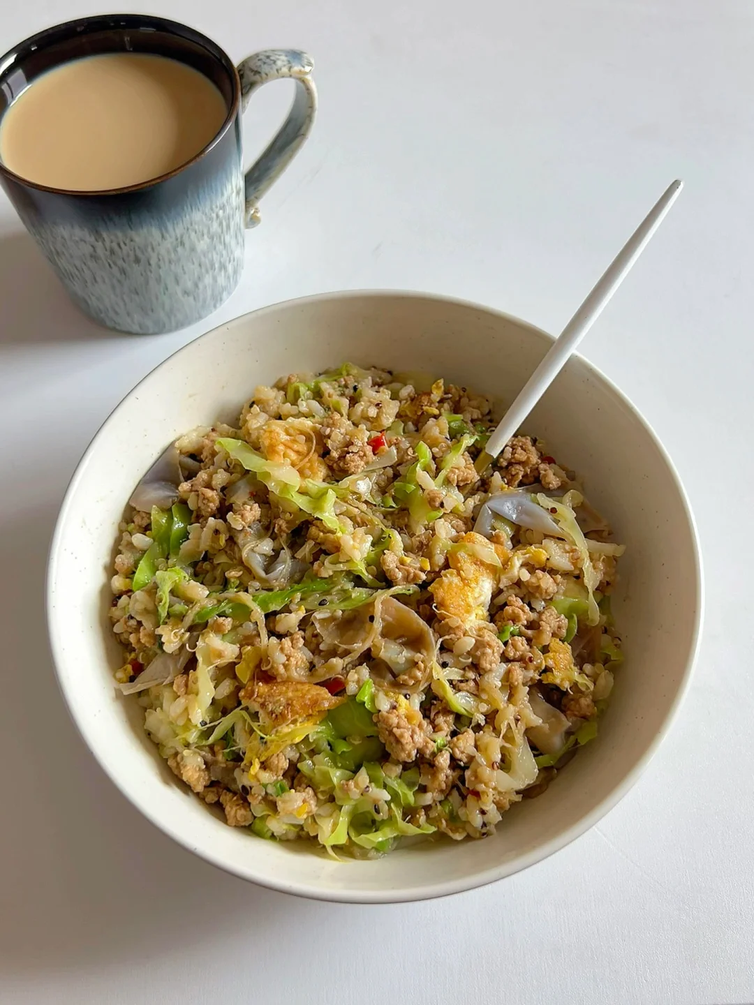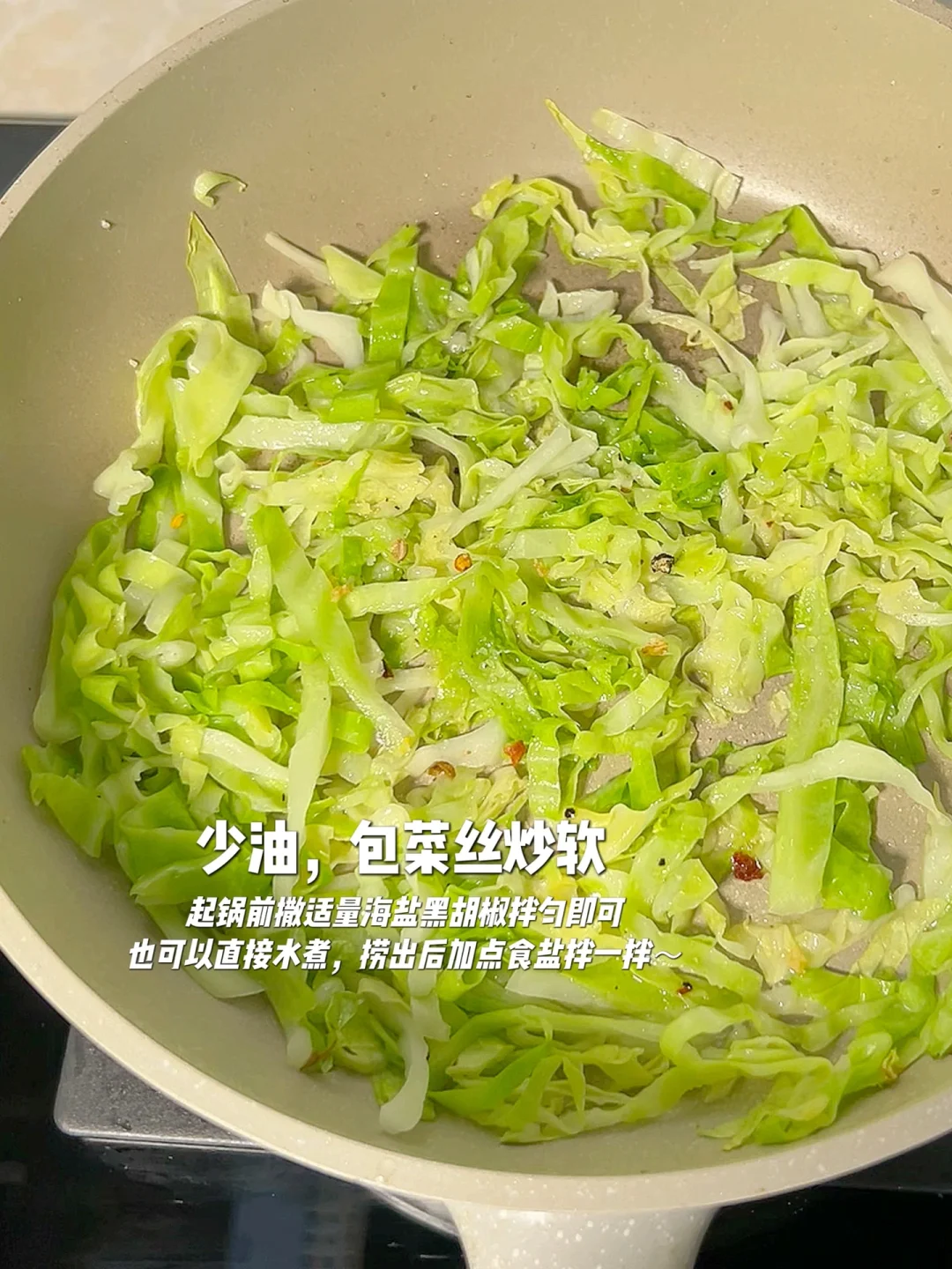 3⃣️ 锅中无油/少油,放包菜丝和少许清水炒软,起锅前加适量海盐黑胡椒拌匀即可;