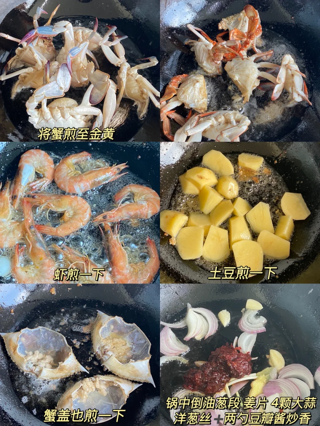 3️⃣起锅加油 将蟹煎至金黄 蟹盖也煎一下 虾 土豆也稍微煎一下