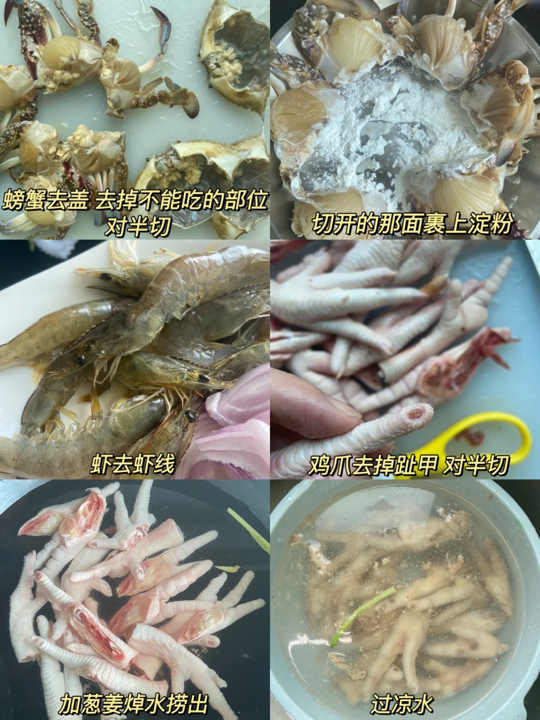 1️⃣螃蟹去盖 去掉不能吃的部位 对半切 切开的那面裹上淀粉 虾去虾线