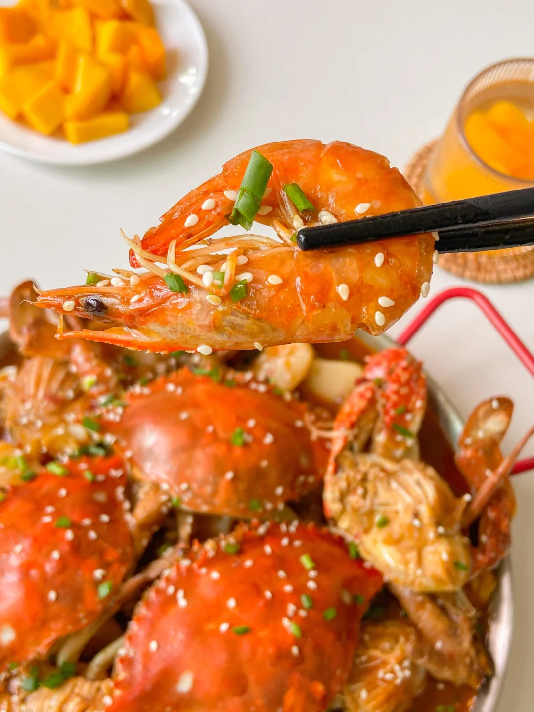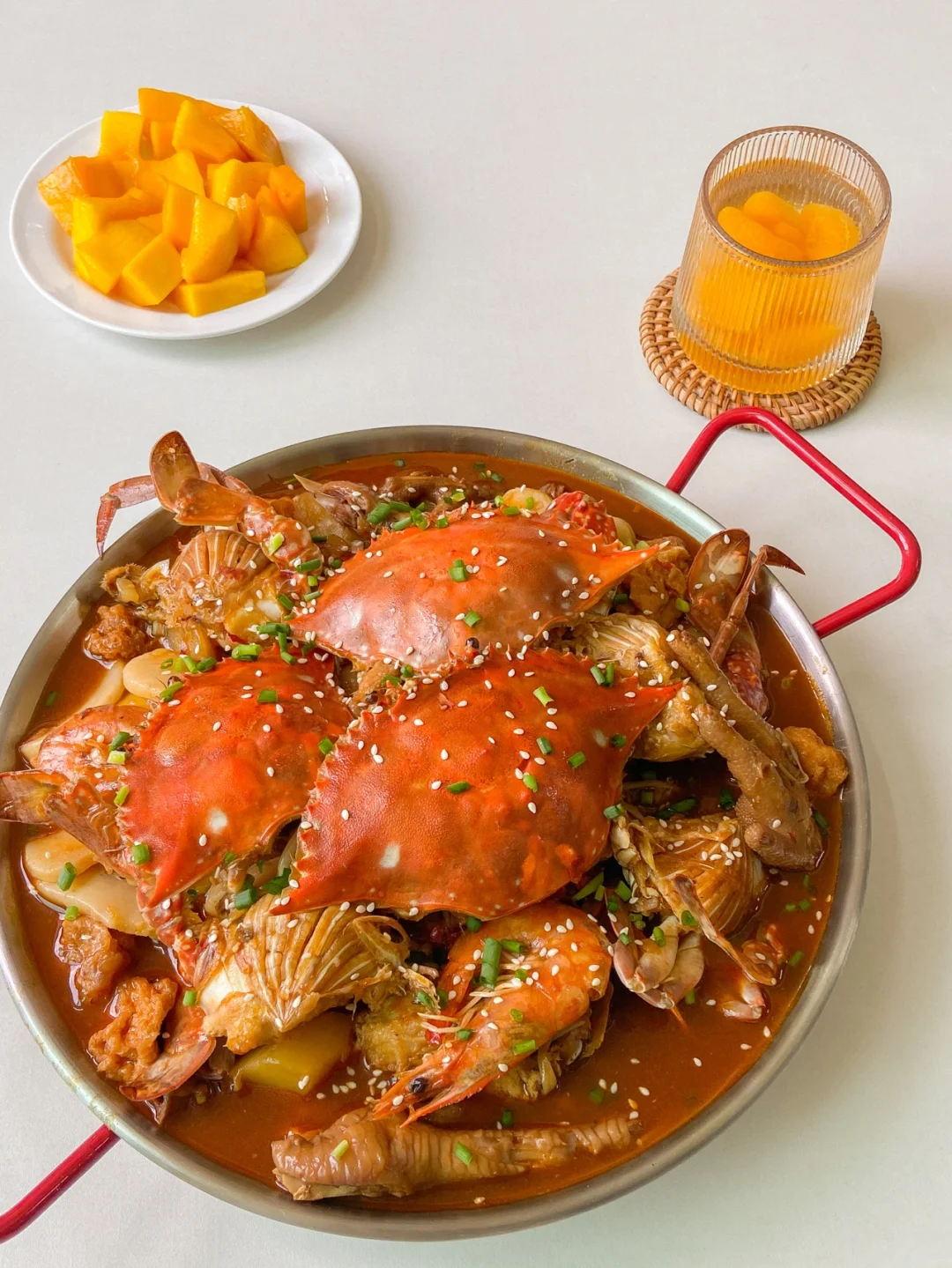 6️⃣加入虾 螃蟹 年糕 螃蟹的盖子面朝下 焖10分钟左右 撒上白芝麻 葱花即可(可以加自己喜欢的配菜 我加了豆腐泡跟金针菇 吸满汤汁的豆腐泡真的太绝了)