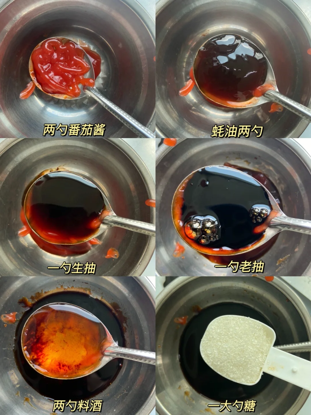 两勺番茄酱➕蚝油两勺➕一勺生抽➕一勺老抽➕两勺料酒➕一大勺白糖