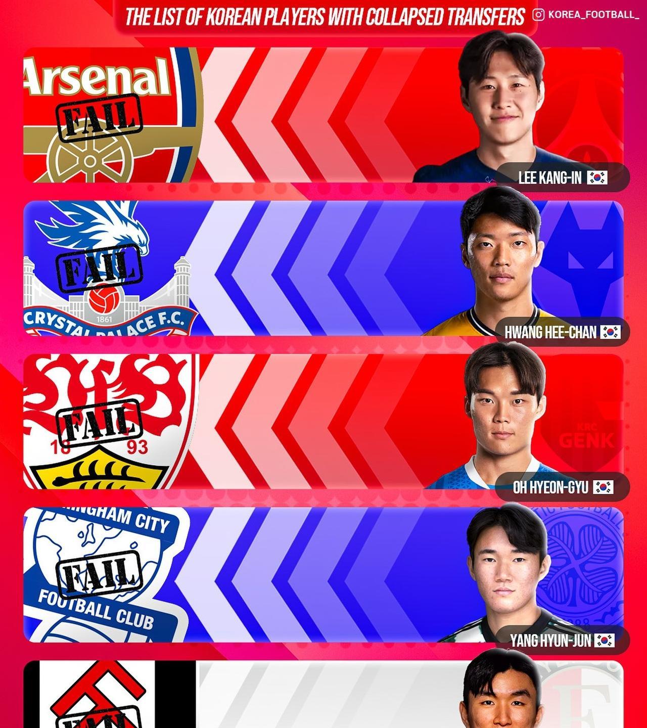 韩国媒体《Korea football》总结了这个夏窗韩国球员的表现,对韩国足球来说这个夏窗是令人失望的,因为在扛旗的孙兴慜离开欧洲主流联赛后,他们仅有在拜仁过的不顺的孙兴慜以及在大巴黎当轮换的李刚仁还在欧洲顶级强队,这显然是吃了多年细糠的韩国足球不太能接受的。但是令人遗憾的是这个夏窗李刚仁、黄喜灿、杨贤俊、黄仁范、吴贤揆都在转会的路上失败了,他们希望能够让韩国球员效力球队整体升级的愿望 还需继续等待。。