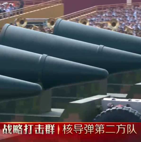 最震撼莫过于,最后压阵而出的巨型导弹,分三截运输,直接展示尾部细节。 这次三位一体的导弹都展示了,空基远程导弹有“惊雷-1”,潜射洲际导弹“巨浪-3”,陆基洲际导弹“东风-31”,还有“东风-61”,这是新型的陆基洲际导弹,注重新字。