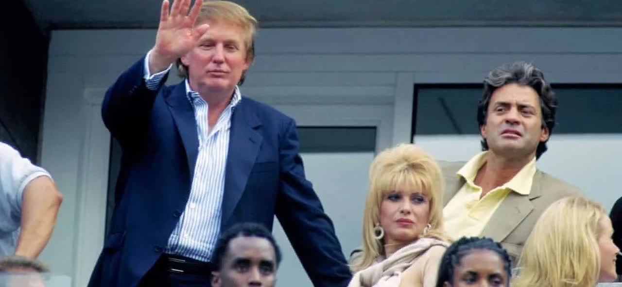 1997年年轻的特朗普出席美国网球公开赛的照片。前面是“吹牛老爹”尚恩·库姆斯和他当时的女友模特金·波特。特朗普旁边的金发美女是他的老婆伊万娜,伊万娜也是伊万卡的妈妈。