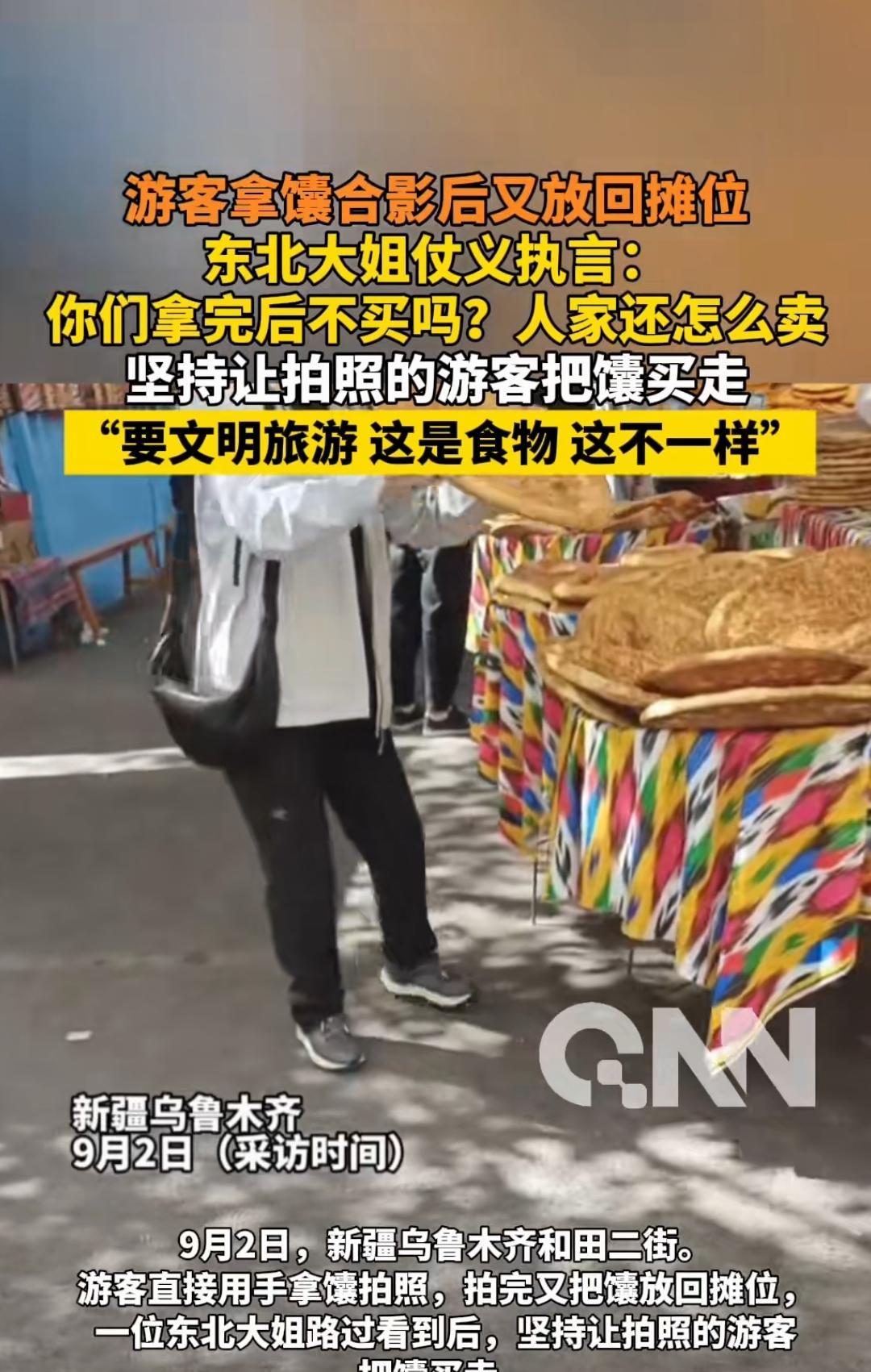 为东北大姐点赞!一东北大姐在新疆旅游,看到一游客直接拿起商家的大馕摆拍照相,拍完照直接放到摊位上要走人!东北大姐直接发声:你光手拿人家馕不买吗?人家还怎么卖呀?应逼着游客买了拿过的馕!大姐的行为值得肯定!