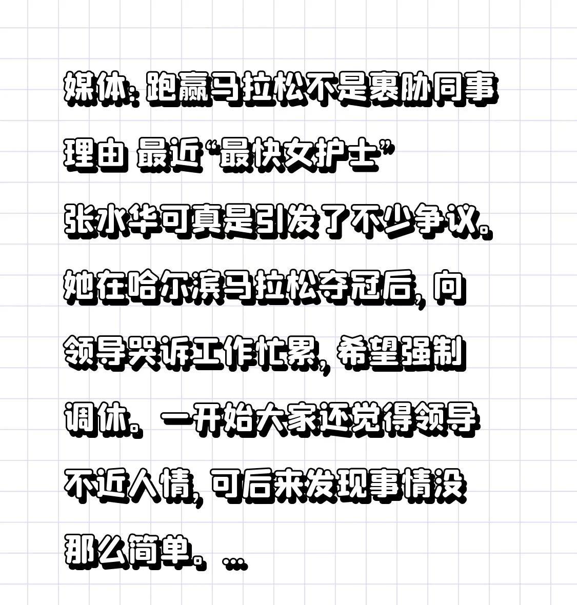 媒体:跑赢马拉松不是裹胁同事理由 媒体:跑赢马拉松并非裹挟同事的理由 近日,“最快女护士”张水华引发了诸多争议。她在哈尔滨马拉松夺冠后,向领导哭诉工作繁忙、身心疲惫,期望能获得强制调休的机会。起初,众人还觉得领导有些不近人情,然而随着事情的发展,真相逐渐浮出水面。 原来,张水华是一名业余马拉松爱好者,仅上半年就投身了9场赛事,参赛地点遍布各地。由于马拉松赛事大多安排在周末,她频繁参赛并申请调休,导致同组同事几乎无法在周末正常休息。实际上,赛前领导就曾明确表示,跑马拉松属于个人爱好,调休需自行与同事协商解决。 但她却选择公开喊话,试图借助舆论的力量迫使领导强制同事调班,这样的做法实在难以让人认同。诚如媒体所言,即便跑赢了马拉松,也绝不能成为裹挟同事的理由。 #马拉松排酸王# #马拉松女子排名# #马拉松救护员# #马拉松劳模#