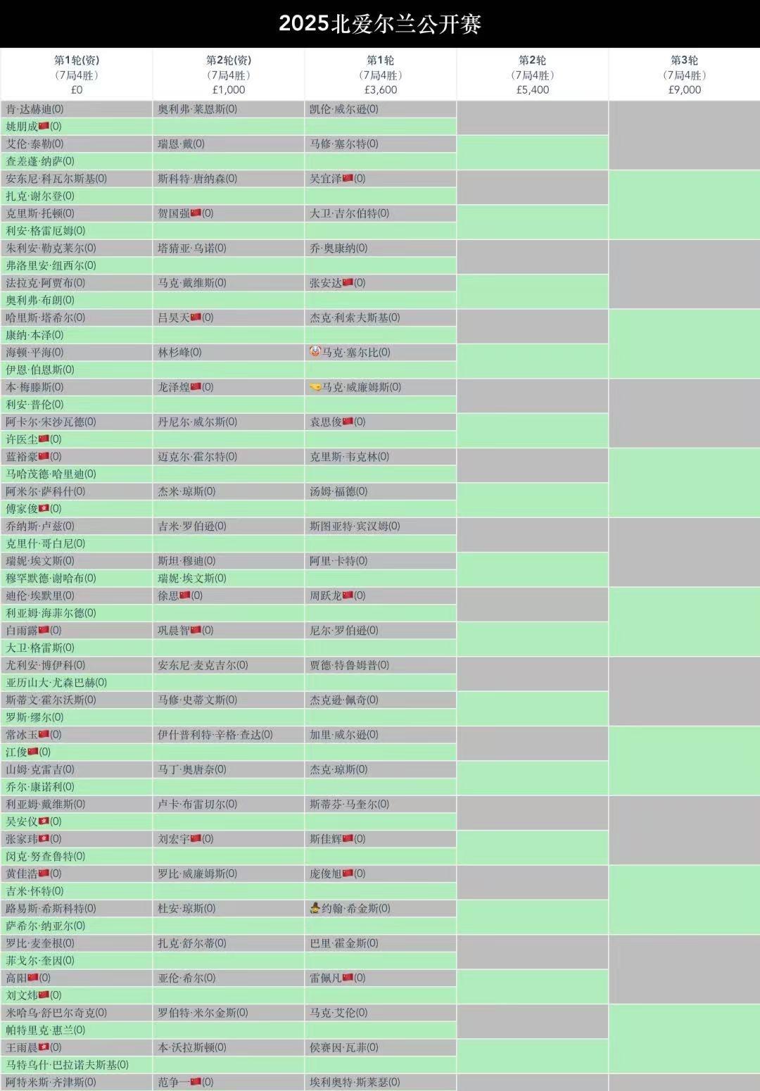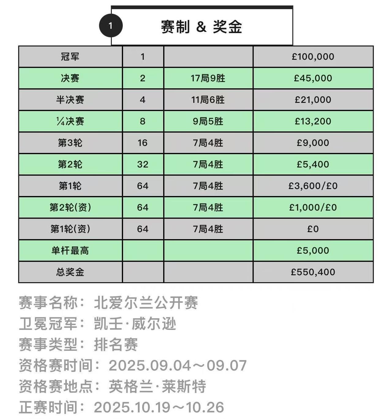 2025北爱公开赛资格赛今日开锣,签表奖金和赛程,傅家俊白雨露今晚出战 2025斯诺克北爱尔兰公开赛资格赛今日开锣,这可是2025 - 2026赛季世界斯诺克职业巡回赛的第7站排名赛 资格赛9月4日至7日在英格兰莱切斯特进行,正赛10月19日至26日在贝尔法斯特举行。 赛会前32位种子按沙特大师赛后排名确定 直接进正赛,火箭、丁俊晖、肖国栋没报名,卡特、加里 - 威尔逊和吴宜泽顺位上升成TOP16。奖金和上赛季一样 冠军能拿10万英镑。 今晚傅家俊、白雨露等出战。首轮资格赛下午5点就开打,姚朋成、蓝裕豪等先登场 晚8点傅家俊对阵萨克霍什 一起期待他们的表现!