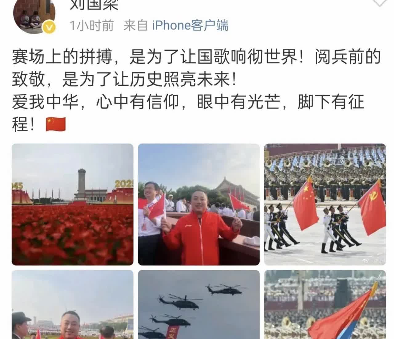 9月3日,原乒协主席刘国梁,受邀去了九三大阅兵观礼台。看着现场壮观的画面,他特意发文说“爱我中华”!字里行间全是自豪。