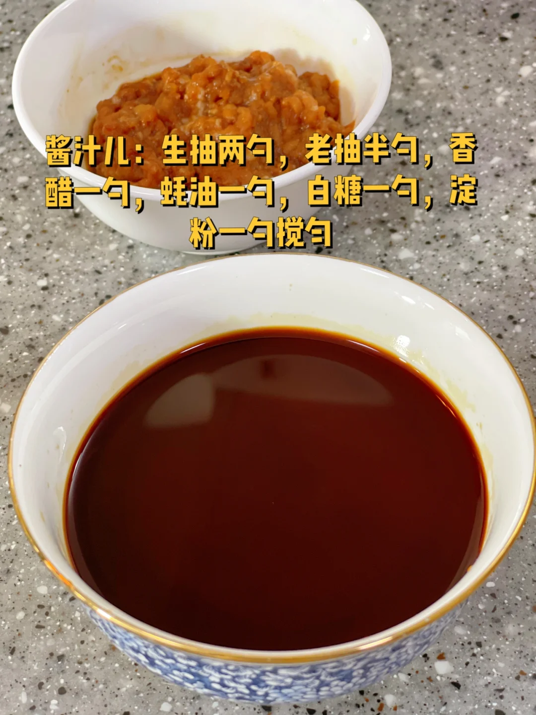 5. 酱汁儿:生抽两勺,老抽半勺,香醋一勺,蚝油一勺,白糖一勺,淀粉一勺搅匀