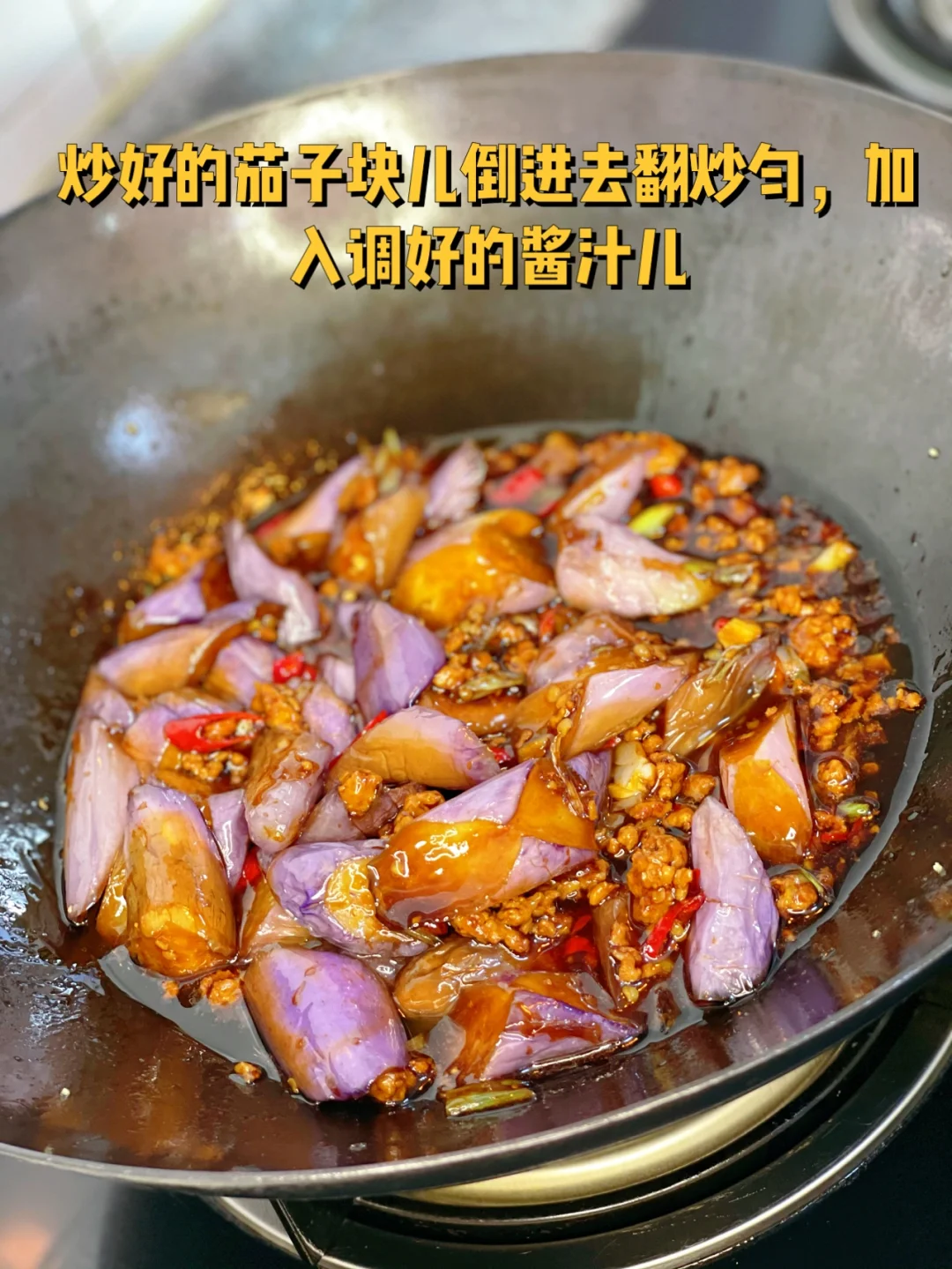 8. 炒好的茄子块儿倒进去翻炒匀,加入调好的酱汁儿