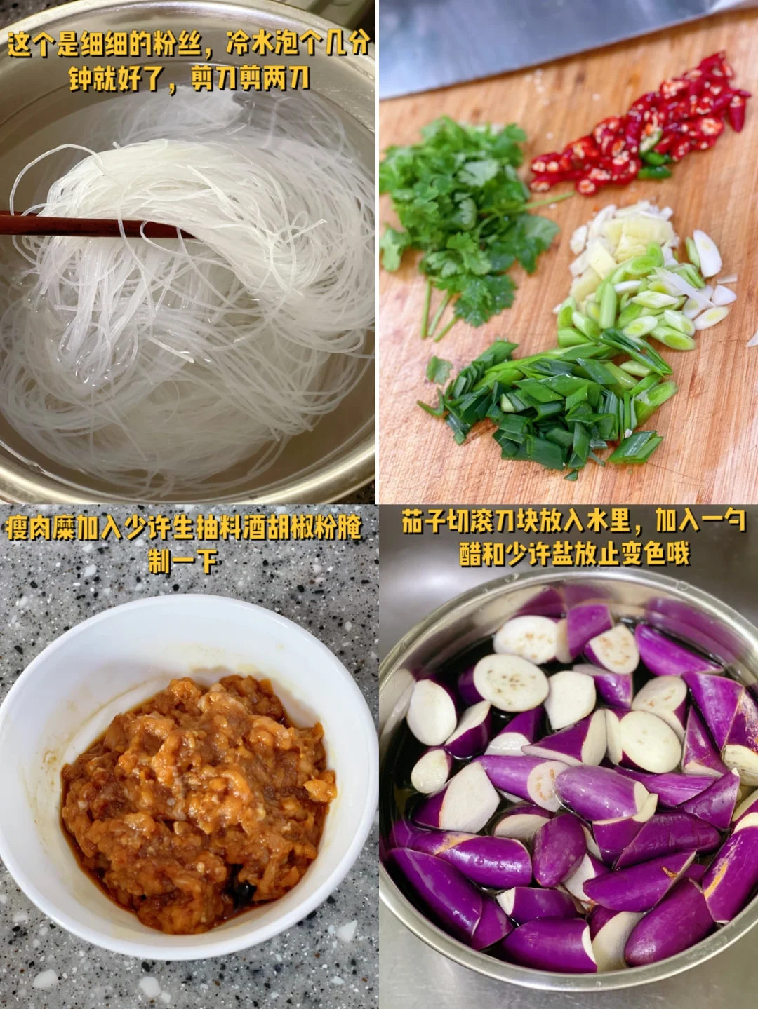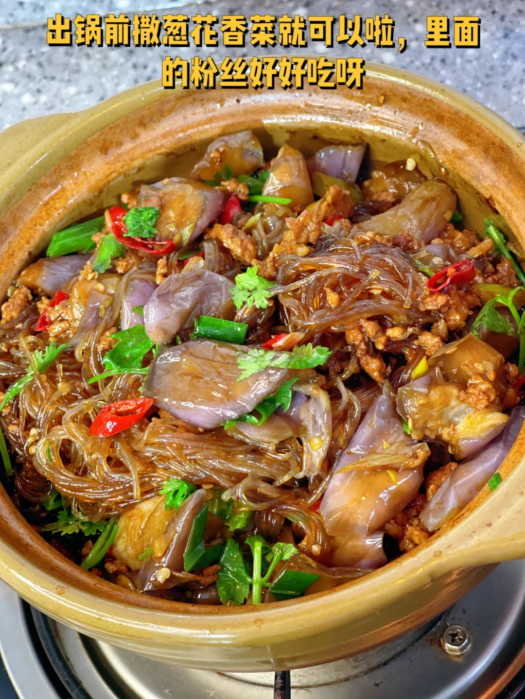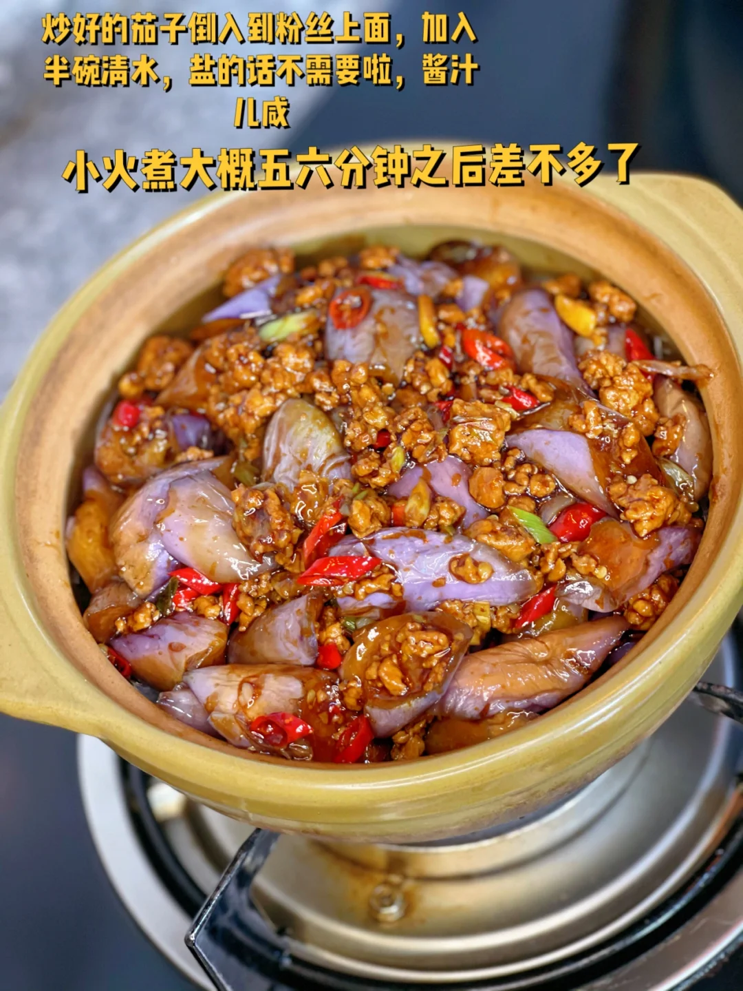 10. 炒好的茄子倒入到粉丝上面,加入半碗清水,盐的话不需要啦,酱汁儿咸,小火煮大概五六分钟之后差不多了