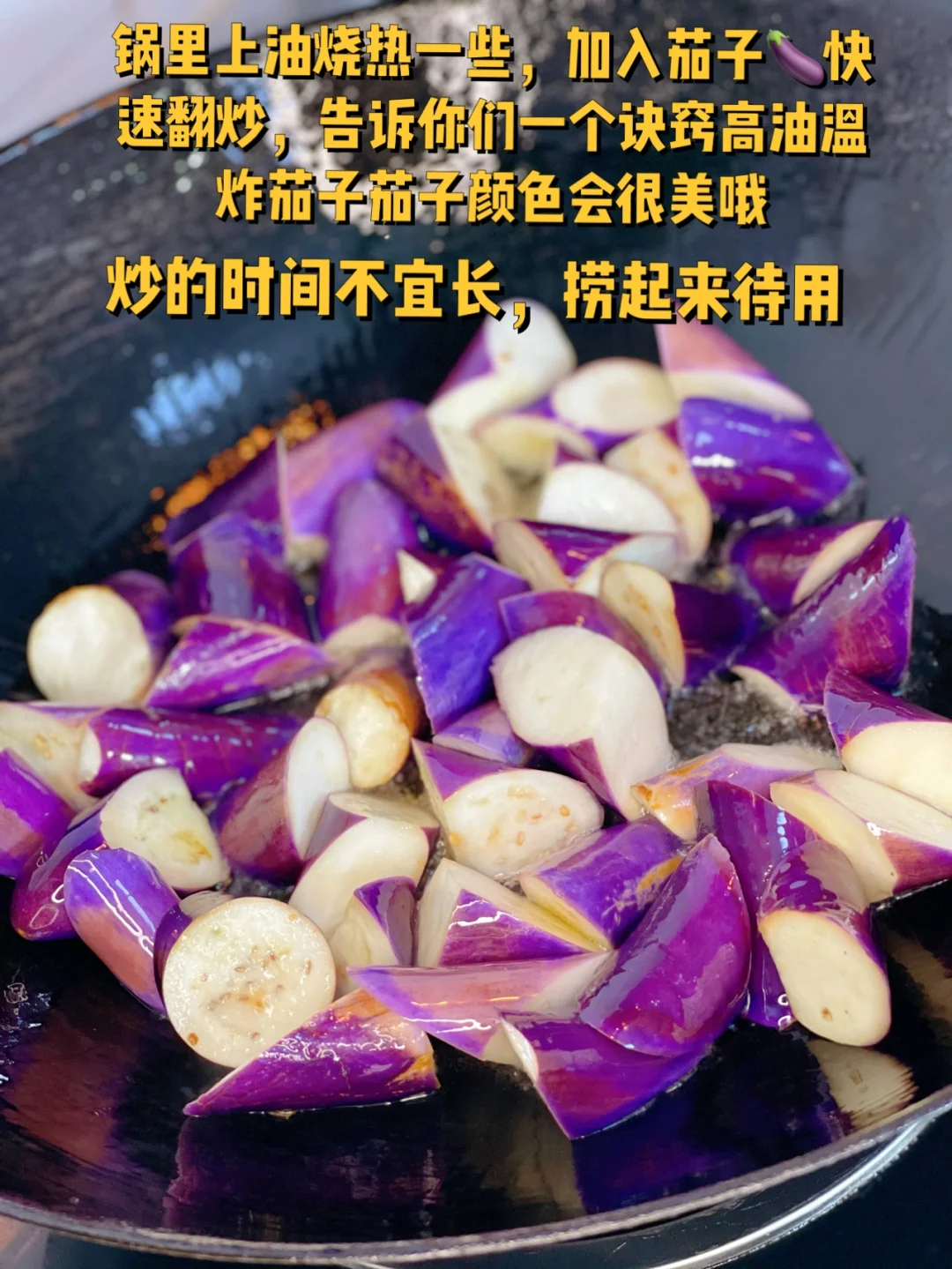 6. 锅里上油烧热一些,加入茄子🍆快速翻炒,告诉你们一个诀窍高油温炸茄子茄子颜色会很美哦