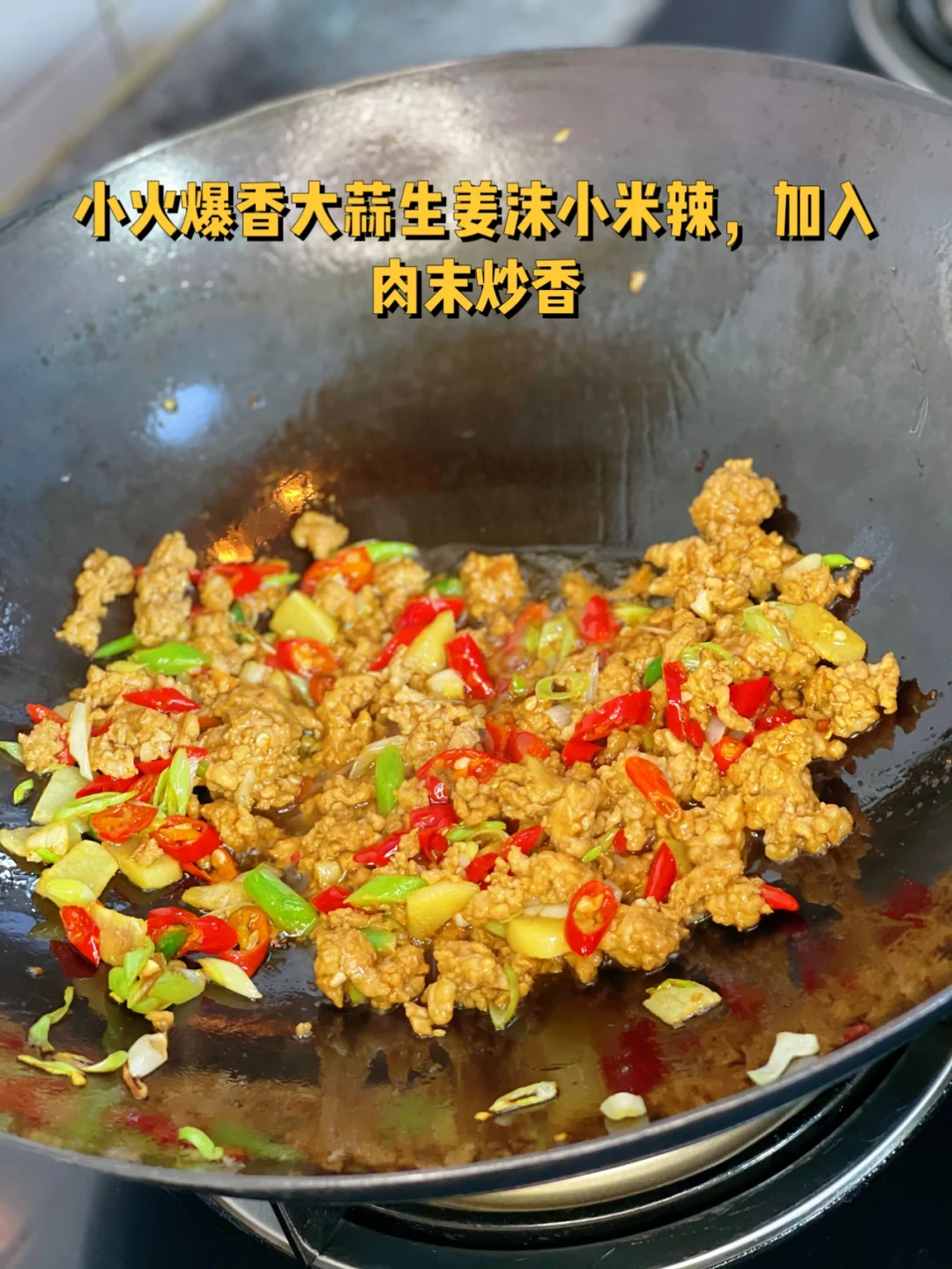 7.小火爆香大蒜生姜沫小米辣,加入肉末炒香