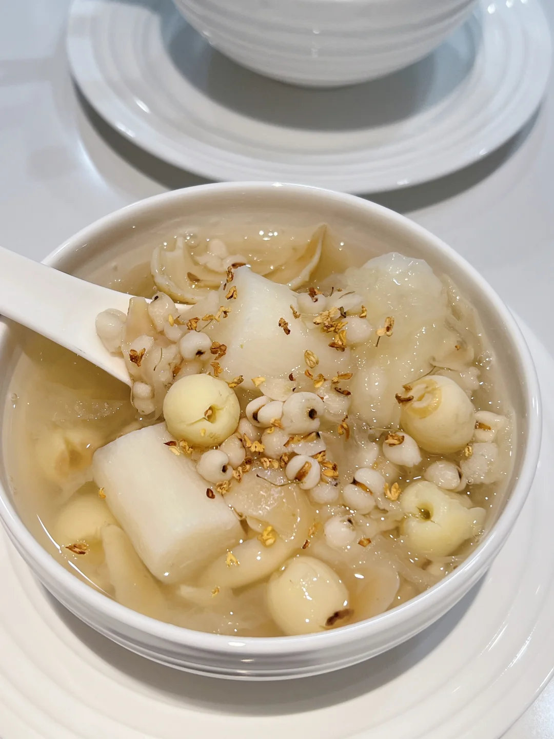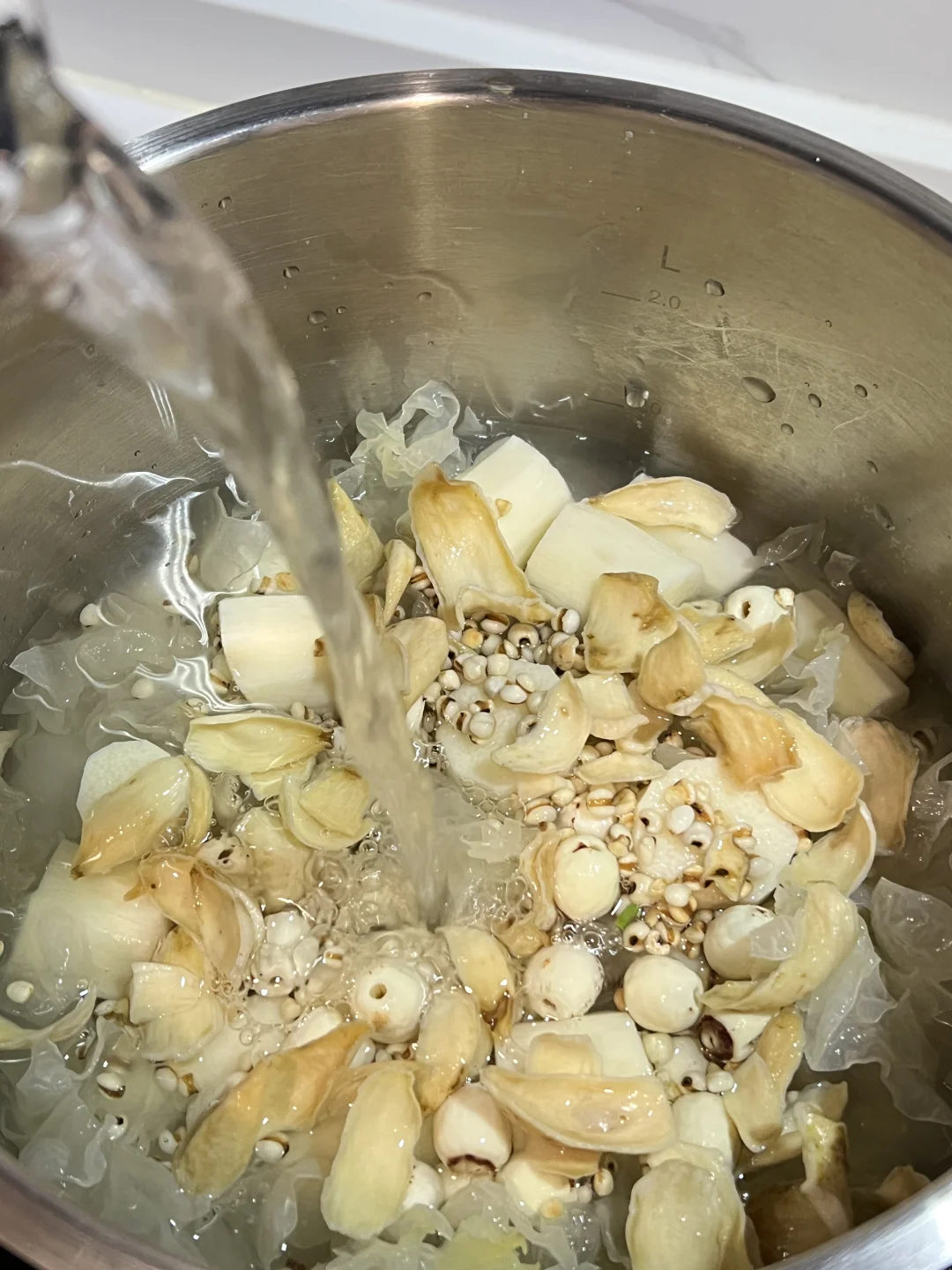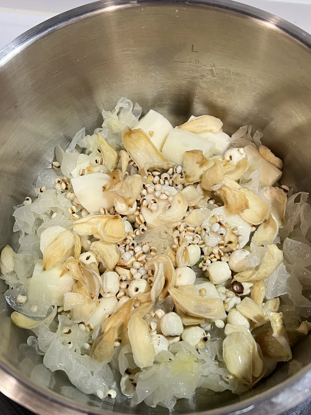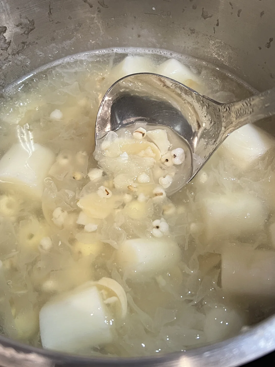 银耳五白羹去湿气真的太厉害了,排走体内多余废水,每周喝一次,美白又祛湿!夏天经常吹空调,冷饮吃多了湿气重,喝它就对了~ 🧑🍳食材: 1️⃣银耳半朵 2️⃣莲子一把 3️⃣百合一把 4️⃣炒薏仁10g 5️⃣山药200g 🥣做法: 1️⃣新鲜银耳去芯,撕成小块,和其他所有食材一起放入锅中,加1.5升清水,大火烧开后,小火煮40分钟即可。 ❗️小贴士: 1️⃣莲子,百合,薏仁提前浸泡一小时。 2️⃣薏仁比较寒凉,可以先炒至淡黄色再用。