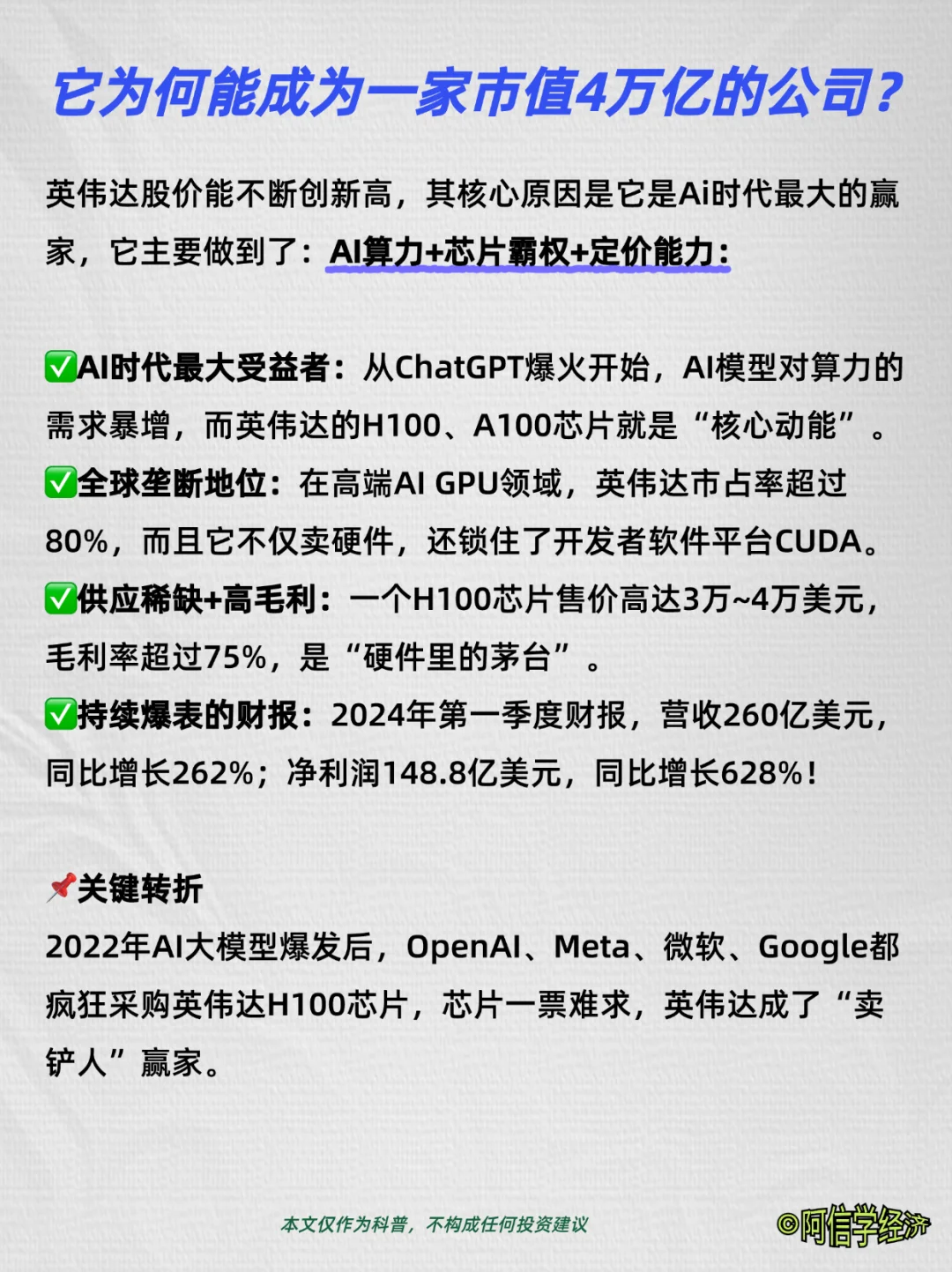 ✅供应稀缺+高毛利:一个H100芯片售价高达3万~4万美元,毛利率超过75%,是“硬件里的茅台”。