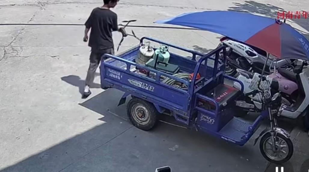 9月2日广东一家电维修店门口,一架无人机降落维修店门口的电动三轮车后面,恰巧这时候,店里的员工准备骑三轮车外出维修,往后倒三轮车时,突然发现后轮压到东西,下车一看原来是是一家无人机,电力员工把无人机拿起放到店门口的凳子上,等待失主来领。