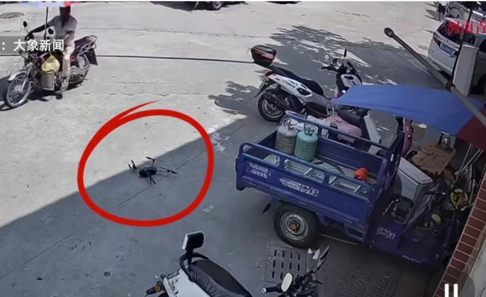 9月2日广东一家电维修店门口,一架无人机降落维修店门口的电动三轮车后面,恰巧这时