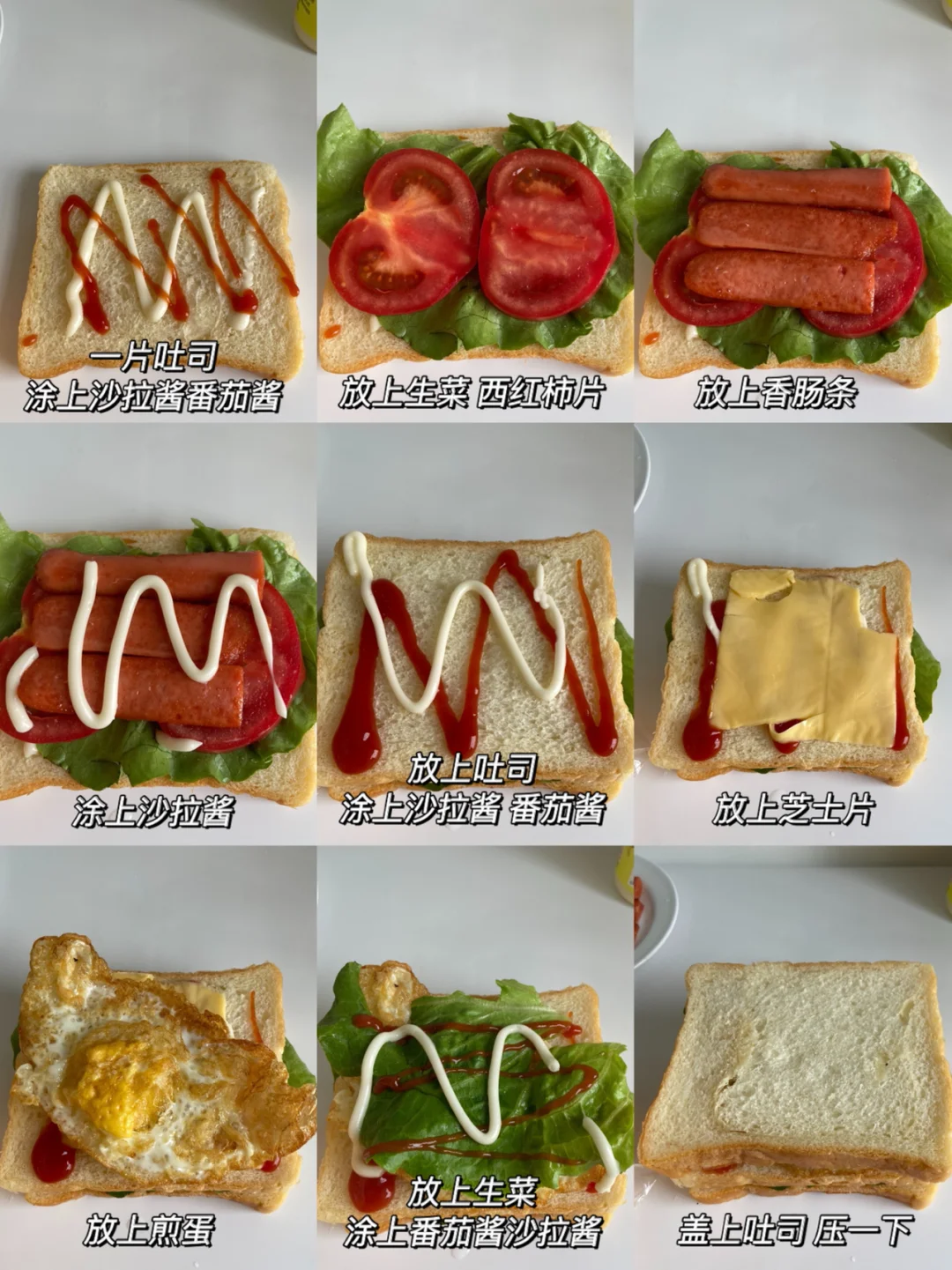 3️⃣先放一片吐司打底 涂上番茄酱沙拉酱 放上生菜 西红柿 火腿 涂上沙拉酱 再盖上一片吐司 在吐司上再涂一层沙拉酱番茄酱 放上芝士片 煎蛋 放上生菜 涂上番茄酱沙拉酱 盖上吐司按压一下