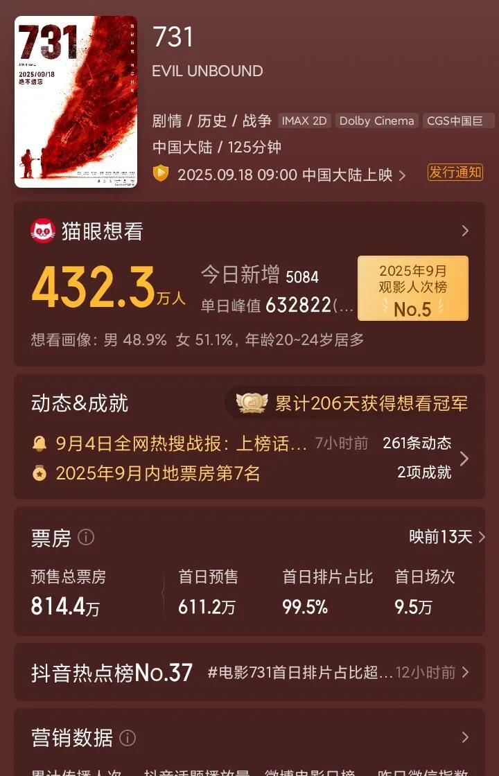《731》50亿票房有希望了,首日排片占比居然高达99.5%,这意味着9月18日