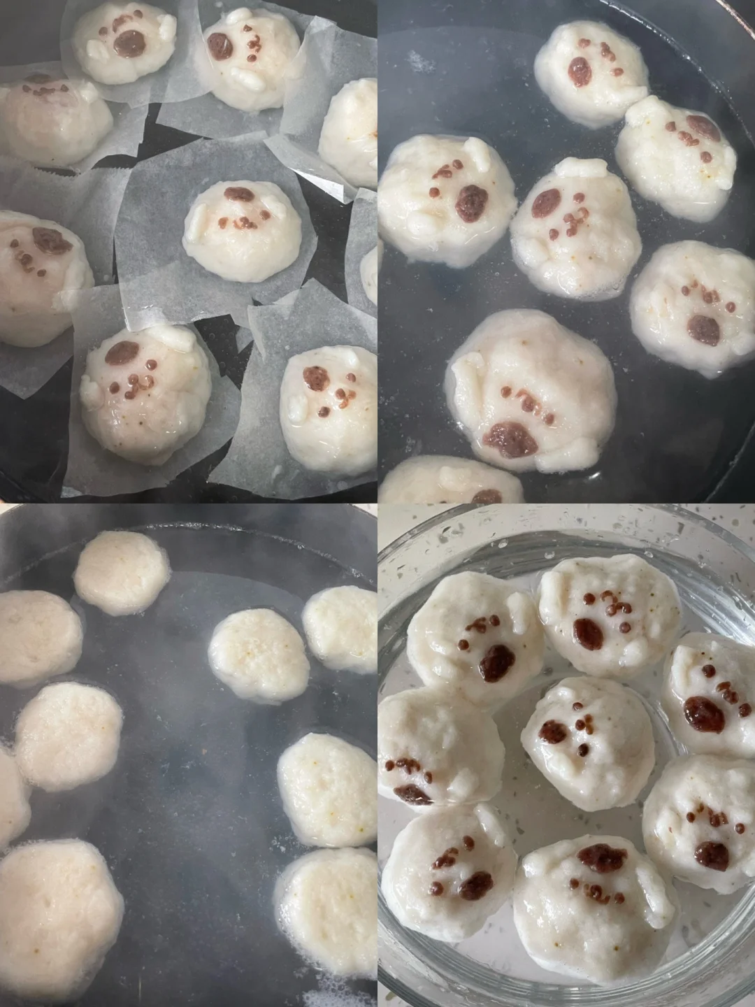 3.烧一锅水,水开后立刻关火,把鱼丸连着烘焙纸(一个一个剪开)一起放入开水里面,全部放入后再开最小火,保持水要开不开的状态,煮8分钟(定型后中途取下烘焙纸翻面煮一下),捞出放入凉水备用