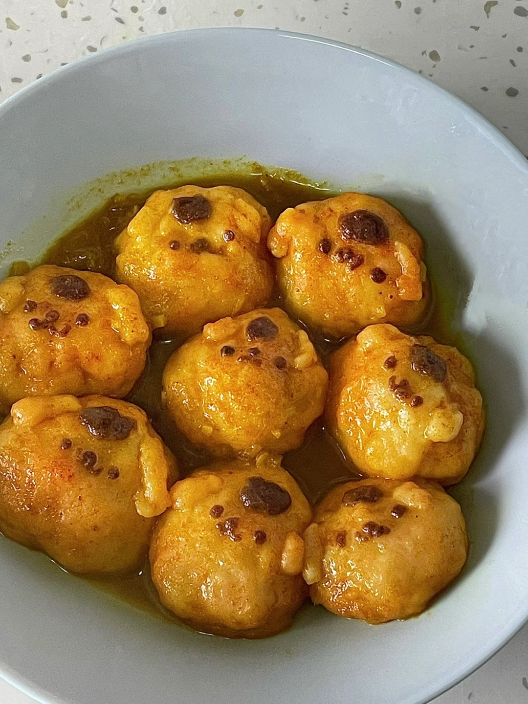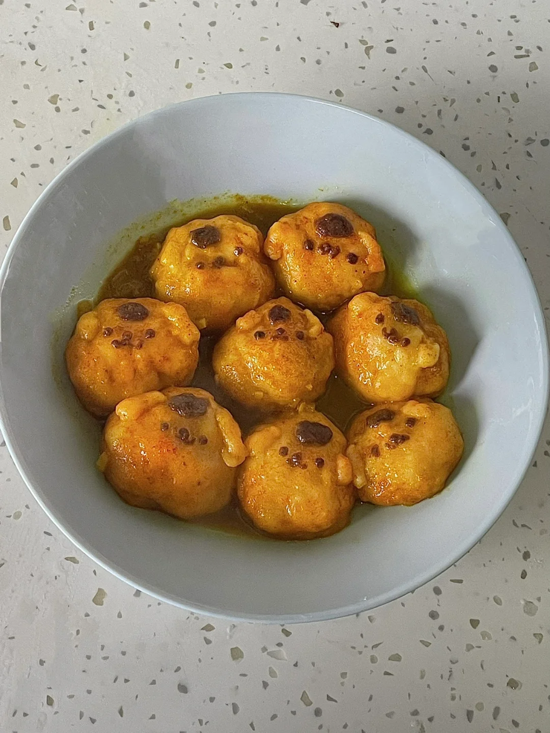 4.锅里放入少许油炒香蒜和洋葱碎,加入咖喱粉(或咖喱块)香味出来后,倒入一碗水,水沸后加入鱼丸,品尝一下需不需要再调味,水收到半干即可