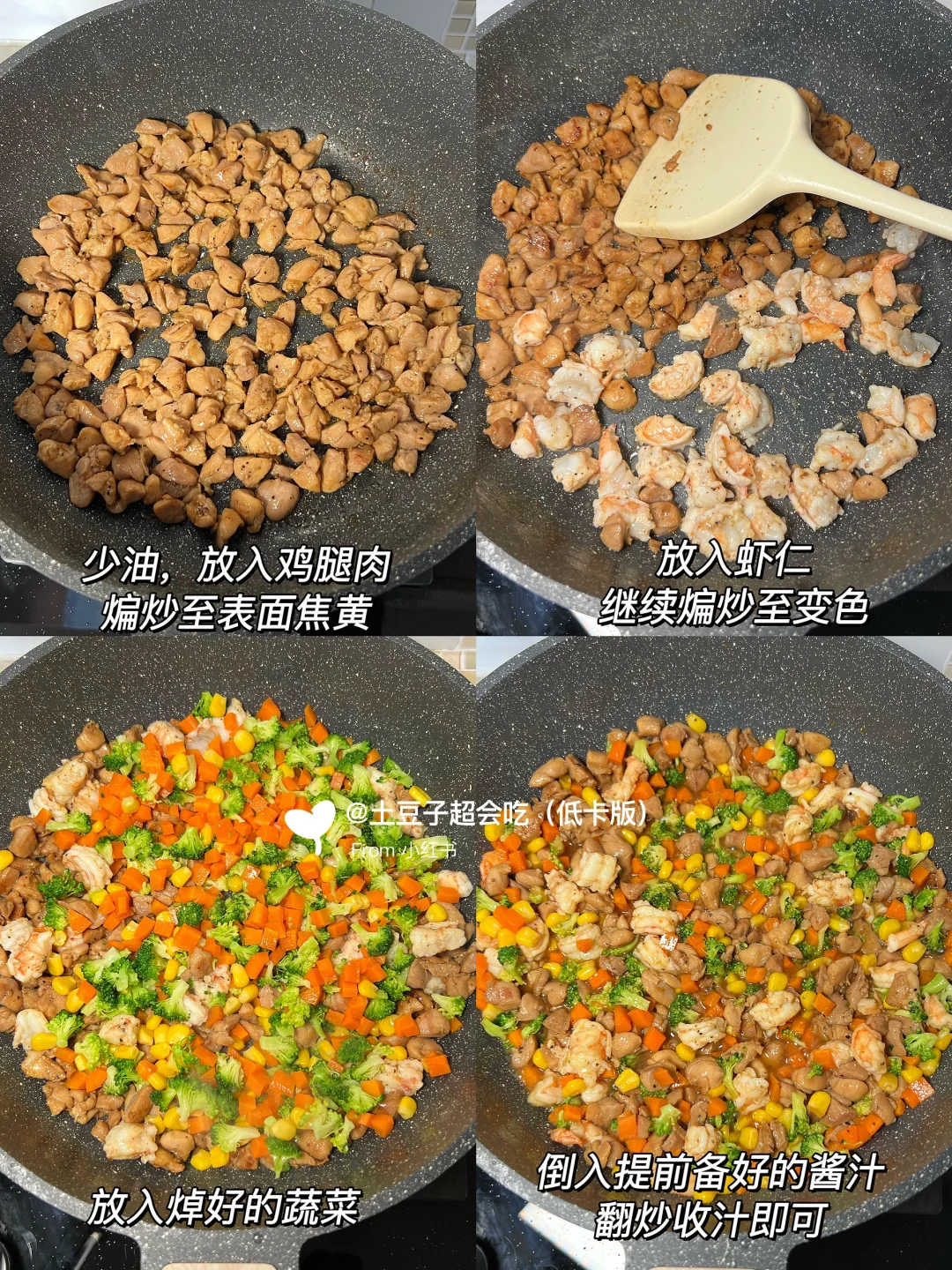 4⃣️ 少油,放入鸡肉煸炒至表面金黄,然后放入虾肉继续炒至变色;