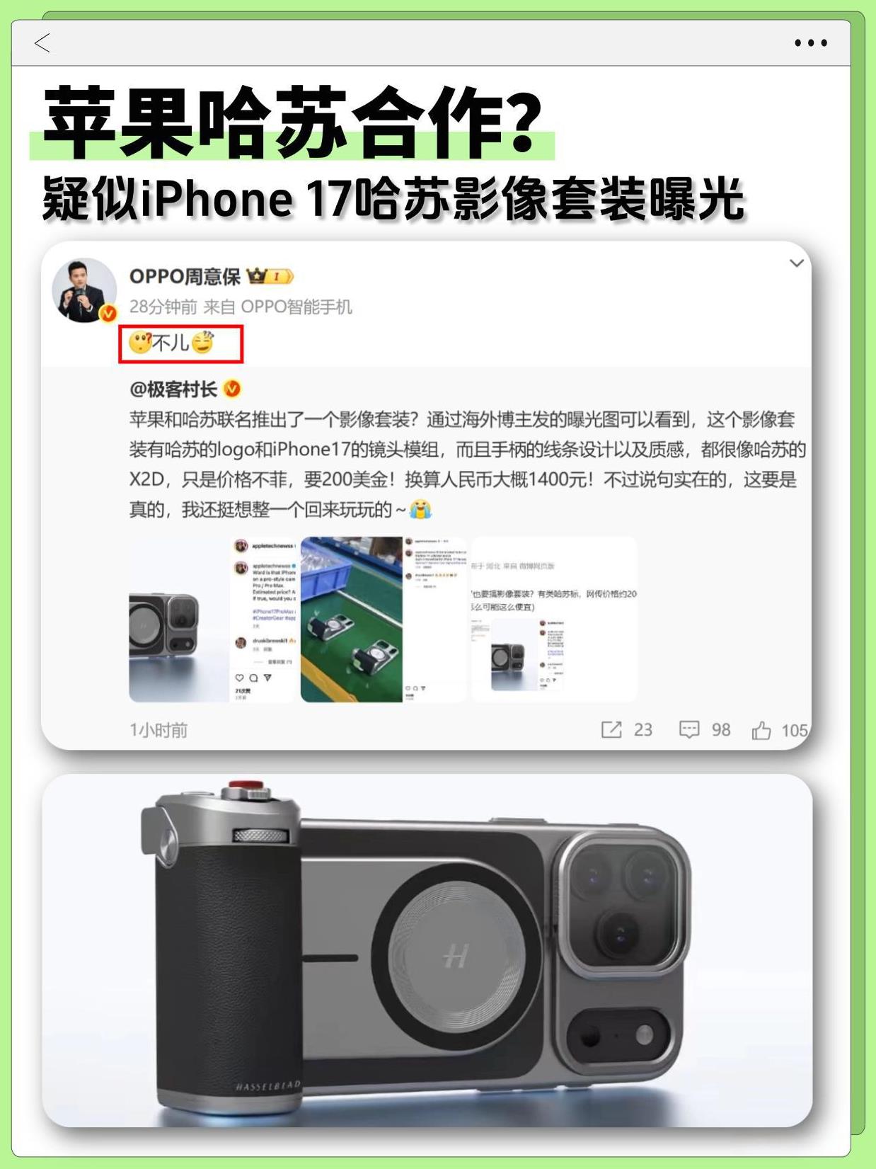 苹果也要和哈苏合作?OPPO:明明是我先! 不过有没有一种可能,是不是Find X9系列也是有哈苏影像套装的? 毕竟保哥之前说这代有新东西,现在还这个反应的?大家觉得呢?