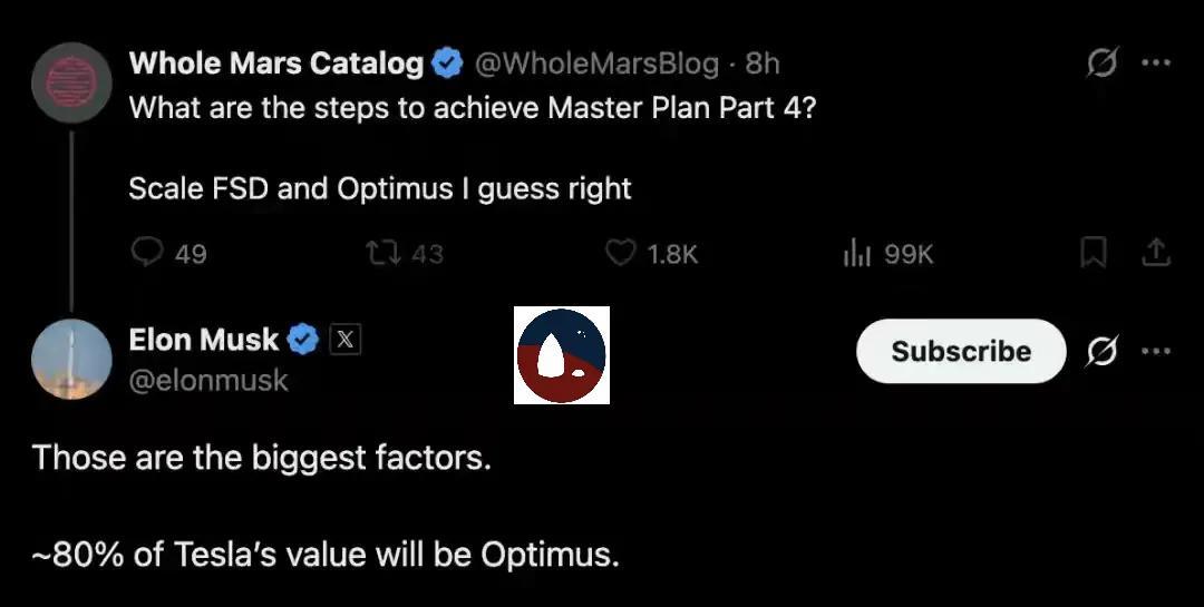 马斯克发帖说, 在未来,特斯拉的价值, 80%是擎天柱。 哈哈哈哈