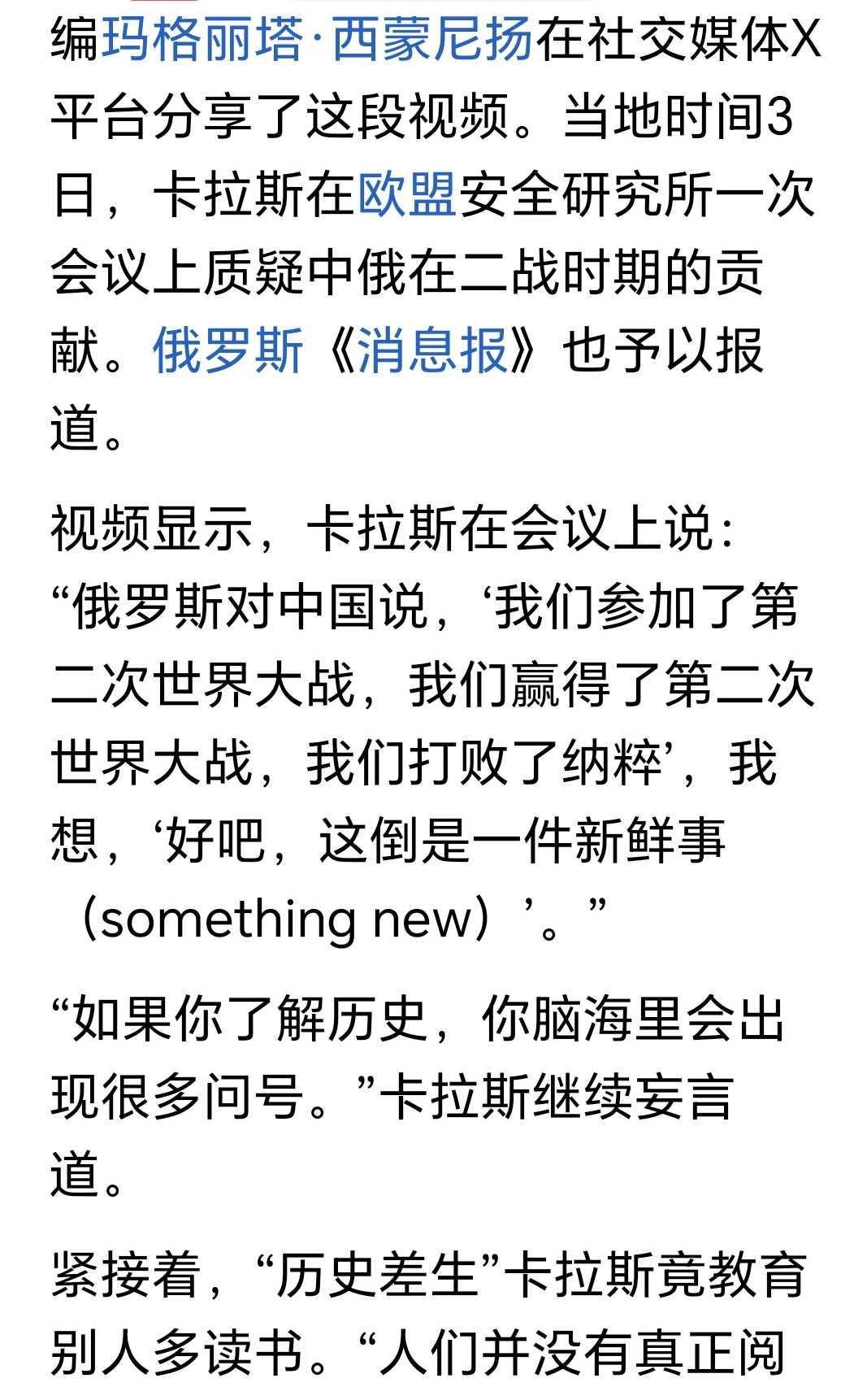 一夜之间,一个欧洲小丑出现了!这个小丑就是欧盟外长卡拉斯。 这个长相还不错的女人出生于波罗的海三傻之一的爱沙尼亚,因为爱沙尼亚曾经是前苏联加盟共和国之一,解体之后与俄罗斯一直关系不睦,她因为对俄罗斯无感,所以凡是和俄罗斯相关的必反,已经到了有点错乱的地步。 首先在9月3日,卡拉斯公开指责中、俄、伊、朝组成专制联盟,挑战基于规则的国际秩序。 然后,她竟然是个历史盲,竟然否定中俄在二战中的贡献,说“如果你了解历史,你脑海里会出现许多问号”。 二战能够取得胜利,说中、苏当居首功毫不为过,我们是亚洲抵挡日本的中流砥柱,而苏联则是在欧洲抵挡德国的中流砥柱,正因为我们两个国家屹立不倒,才有后面的二战胜利。 而且伤亡人数也是苏联最多,我们次之,这些都是历史,不容否认的历史,想不到一个堂堂的欧盟外长竟然连这个历史都不知道。 美国人前期是作壁上观,隔岸观火,坐收渔翁之利的,他实力强大来源于发两边之财,所以他们根本配不上首功,欧盟的人为什么有这种认知呢?因为欧盟内部竟然没有一个能够算是战胜国,他们大多数都投降了德国,包括那个法国,德国人在投降的时候发现法国竟然是战胜国就觉得好笑。欧洲除了俄罗斯之外,还有一个国家居功至伟,那就是英国,可惜英国已经脱欧了,俄罗斯也不是欧盟成员国。 也就是说整个欧盟里面很难找到一个二战战胜国,所以才出现如今这种认知,一点毫不奇怪。 这个世界至今都没有变过,当年最强的国家就几个:英美德日苏中,如今还是几个:美俄中,其它国家只能是跟随者。