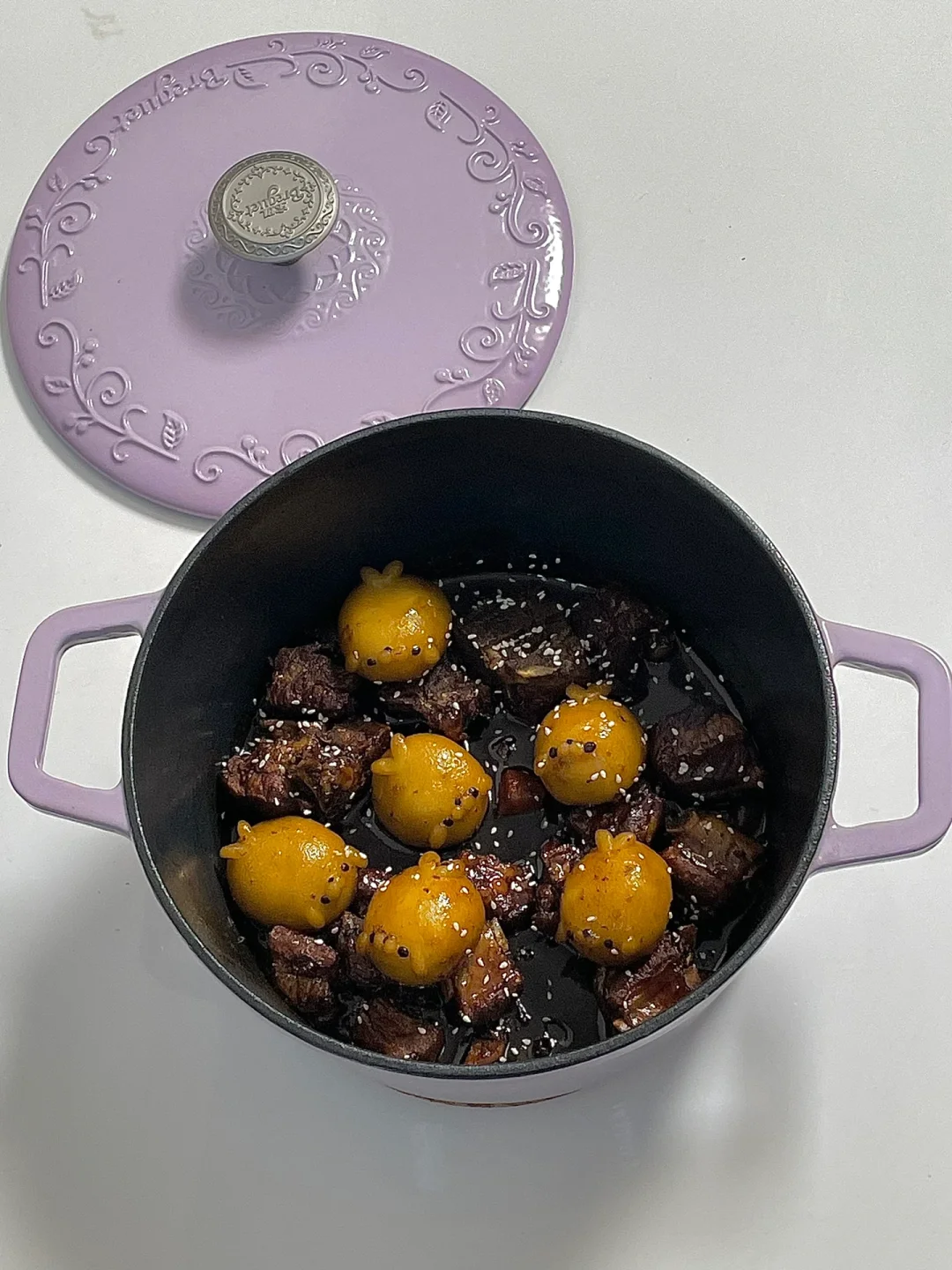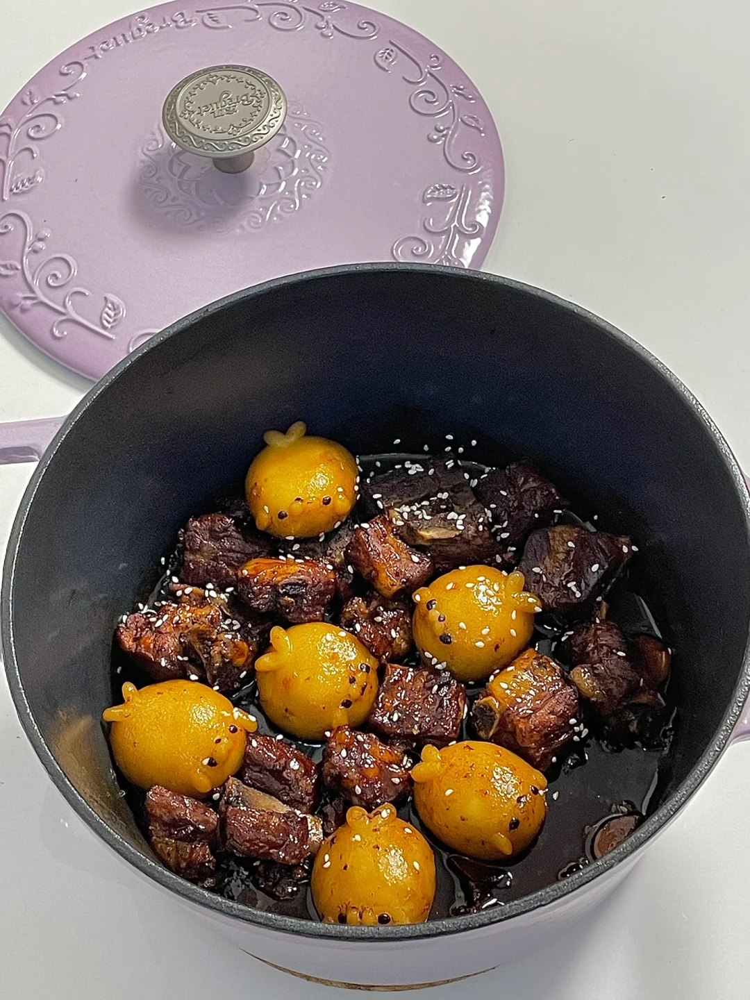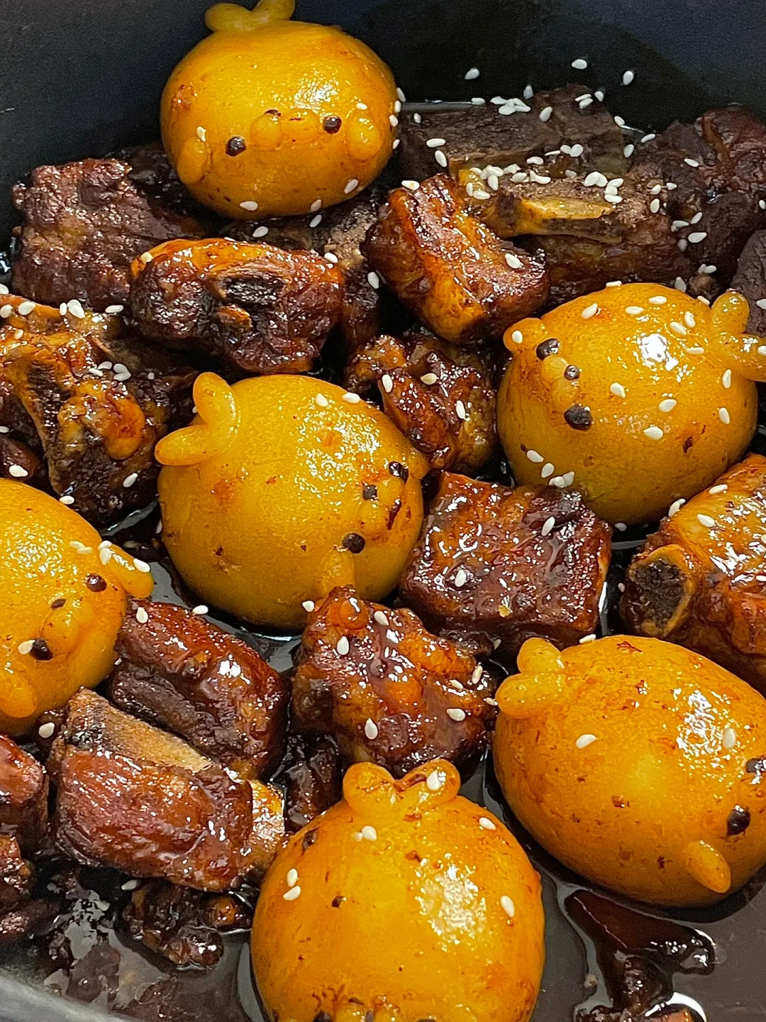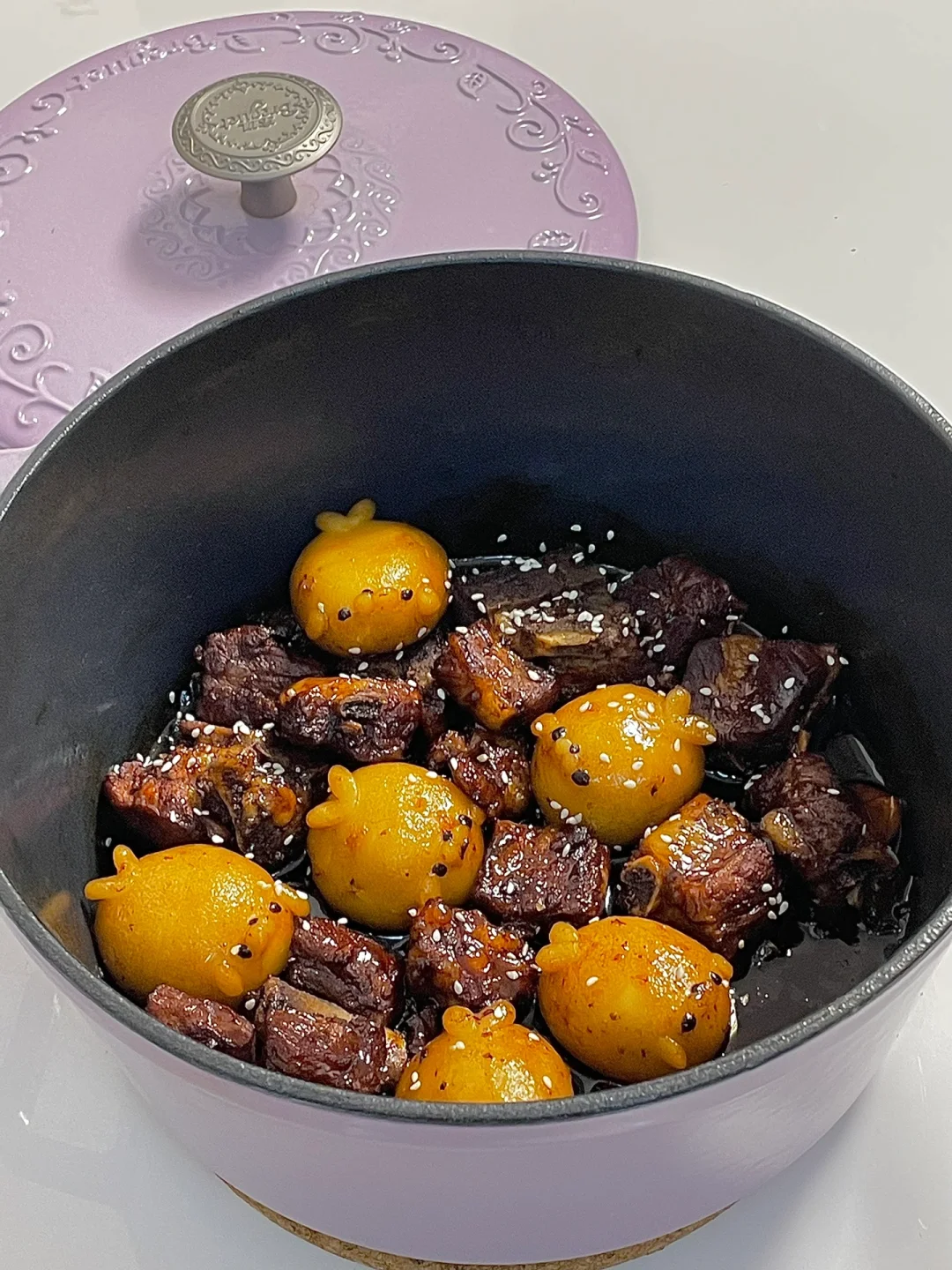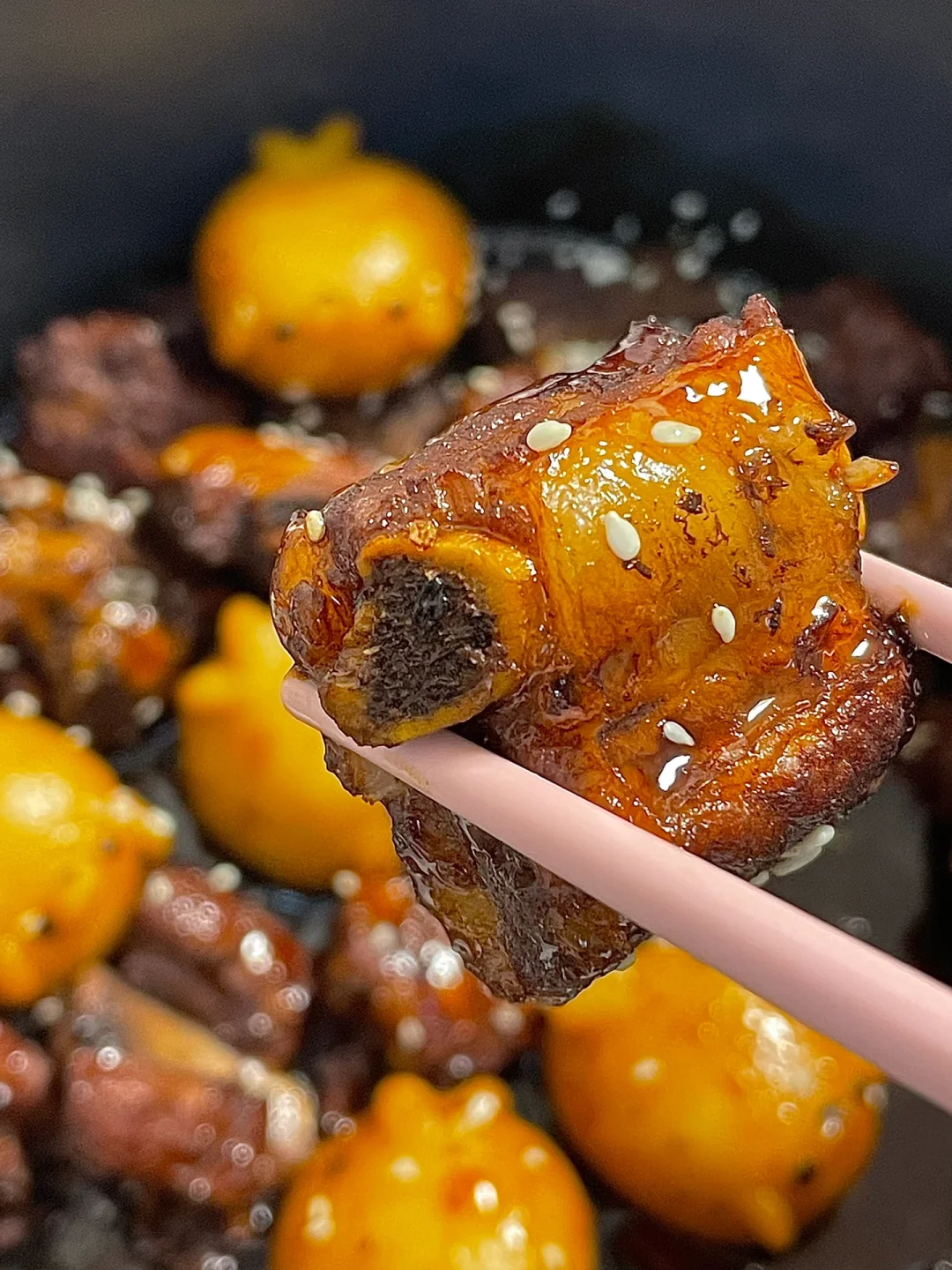 4排骨煮软后,加入配料B和年糕,收汁后撒上芝麻