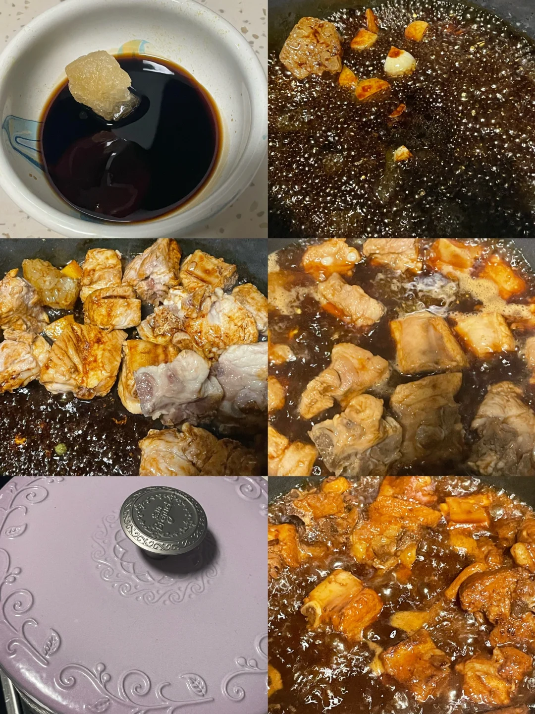 2.锅中加入底油和蒜末炒香,再加入除排骨的配料A,冒泡后加入排骨炒至颜色均匀后加入半锅水,再加点盐,盖盖大煮一下