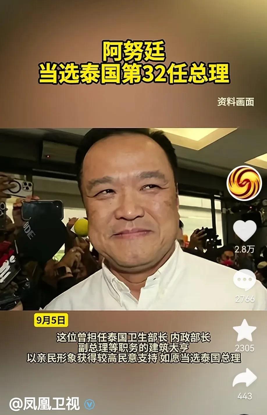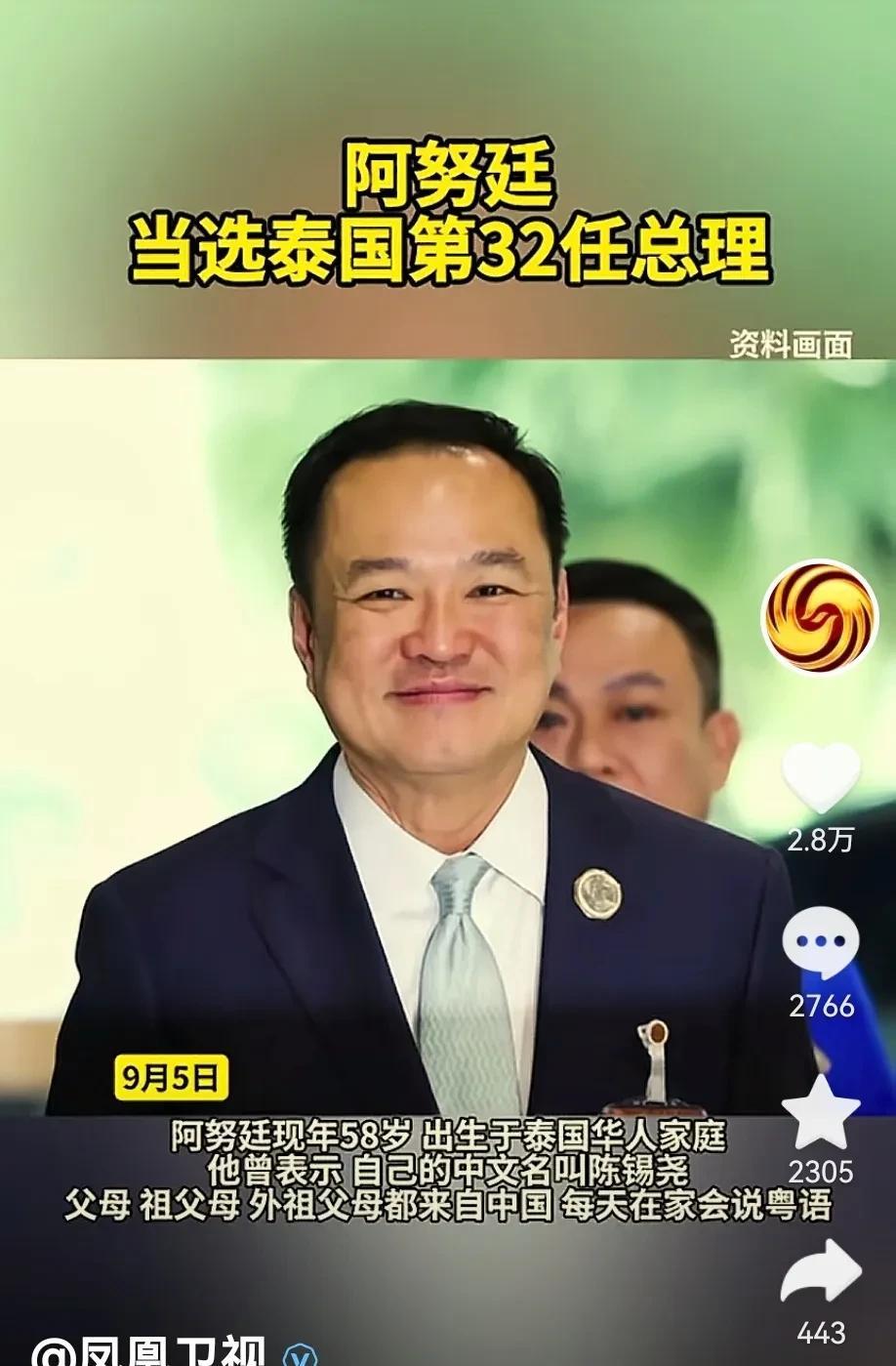 阿努廷泰国第32任总理,简直不敢想象,一个建筑大亨而且还是中国华人再次当选泰国总理。 阿怒廷真名是陈锡尧,这次以亲民形象获得大多数民意支持,他是广东人,他的父母和外祖父等人都是中国人,而且他们经常说粤语。 首先恭喜阿怒廷当选泰国总理,希望他带领泰国与中国继续合作,使中泰两国更上一个台阶,给两国人民带来更多福祉。 #泰国总理# #泰国新首相# #泰国换总理# #泰国总理府# #泰国阿怒廷#
