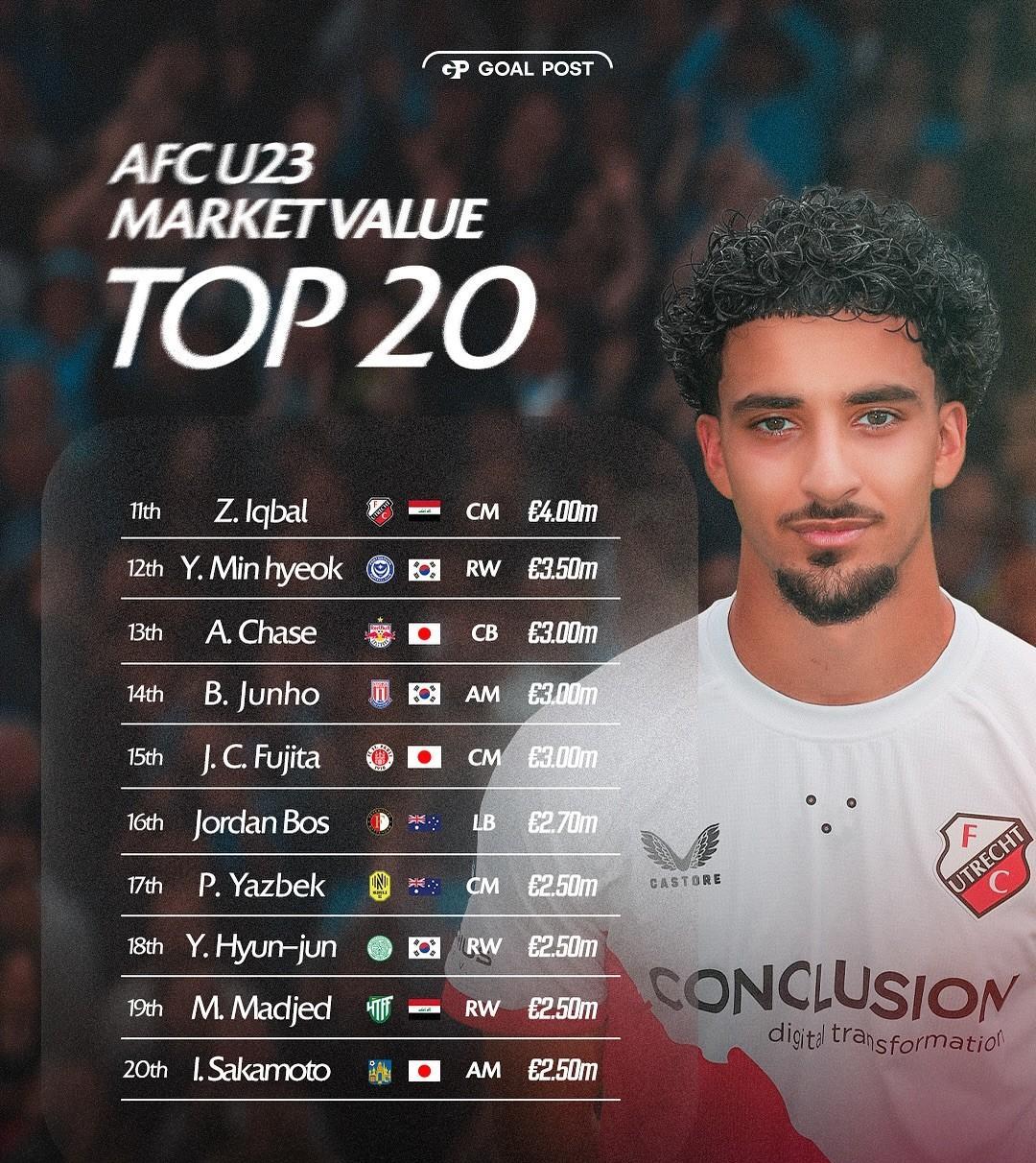 这是亚洲范围内U23球员的身价排行榜,虽然21岁的胡桑诺夫在曼城的发展没有那么顺利,但是他还是以3500万欧元的身价高居榜首,日本球员铃木彩艳以及铃木唯人分别以2000万欧元和1000万欧元分列二三位。 在这份榜单里日本球员占了绝大多数,有七名球员上榜,澳大利亚和韩国以四名球员排在第二,乌兹别克斯坦、伊拉克各有两人上榜,最后一人来自沙特。 遗憾的是王钰栋没能进入这份名单,所以说虽然我们的年轻人从王钰栋和蒯纪闻这波开始确实开始慢慢崭露头角,但在亚洲范围内还需要更加努力。。