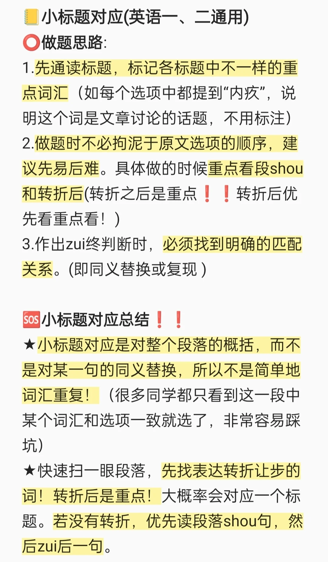 ★小标题对应是对整个段落的概括,而不是对某一句的同义替换,所以不是简单地词汇重复!(很多同学都只看到这一段中某个词汇和选项一致就选了,非常容易踩坑)