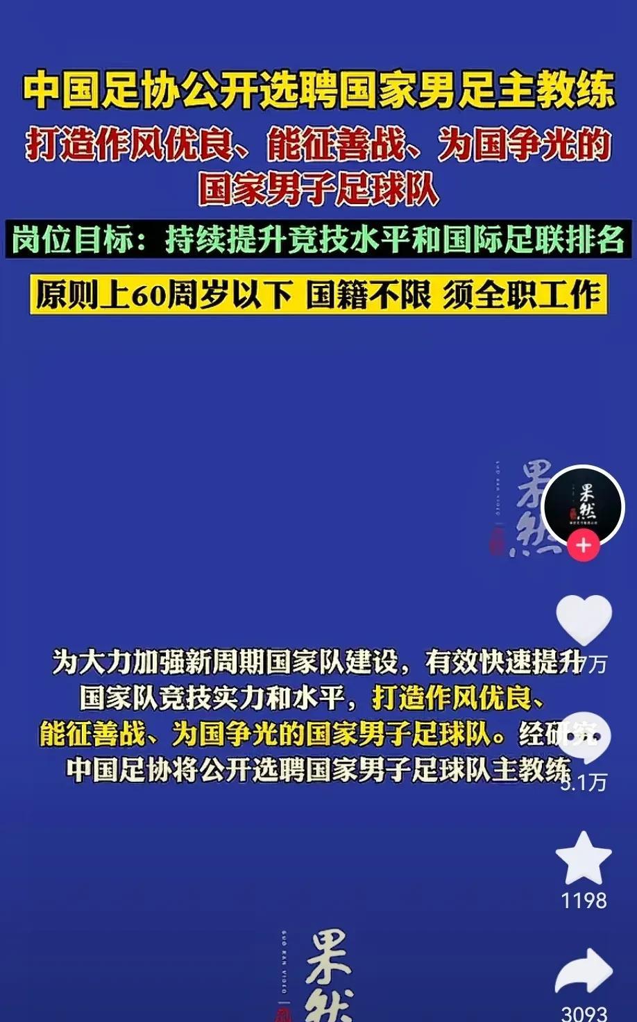 哎呀!妈呀! 中国足协这次公开选国家队主教练,这还是历史先例呢? 大家认为这次国