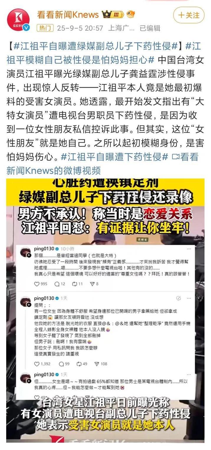 “那男的缺妈吗?”、“既然是男友,何来的性侵?”、“性侵,也不能找个将近50岁的妈妈吧?”太离谱了,47岁台湾女星江祖平自曝被25岁富二代性侵,但是评论区居然出现了一些力挺富二代的声音,他们指责江祖平是捞女,不该起诉富二代并索赔1300万台币,还阴阳怪气的说假如男方是没钱的平民,估计江祖平就会放过他。 他们认为47-25=24的年龄差太大,并且不怀好意的说该委屈的应该是富二代,富二代才是受害者,理由仅仅是25岁富二代说和47岁女星是正常恋爱交往,不存在性侵。 这是典型的“受害者有罪论”,本人站队47岁女星这一边,首先无论年龄差距有多大,已经分手违背女性意愿就是强奸;其次江祖平保养得当看上去也就30出头,有的男的就喜欢成熟知性比自己年龄大的女性很正常;很多因为女性年龄大24岁就发表恶俗言论质疑的网友素质实在是太差了!