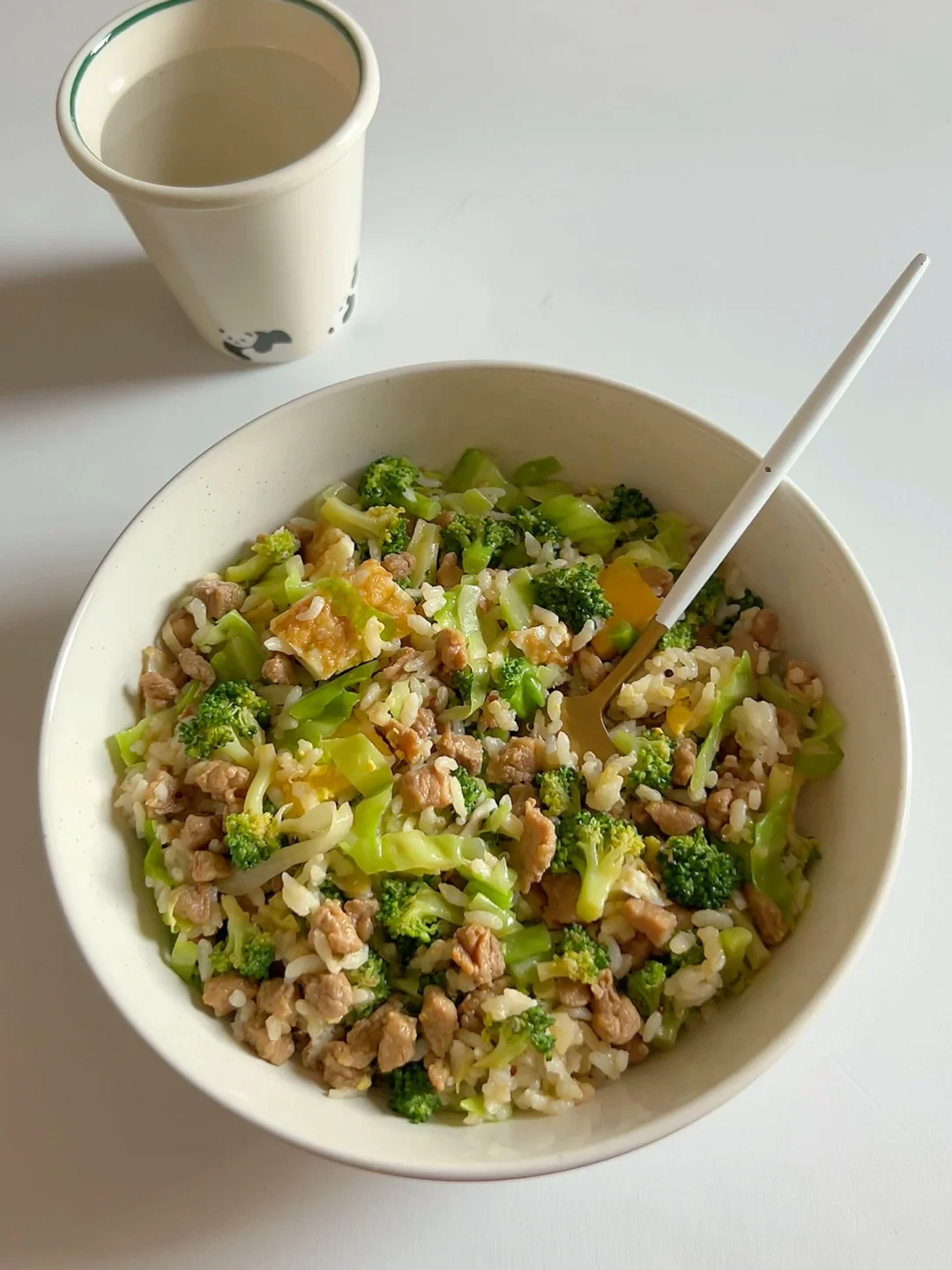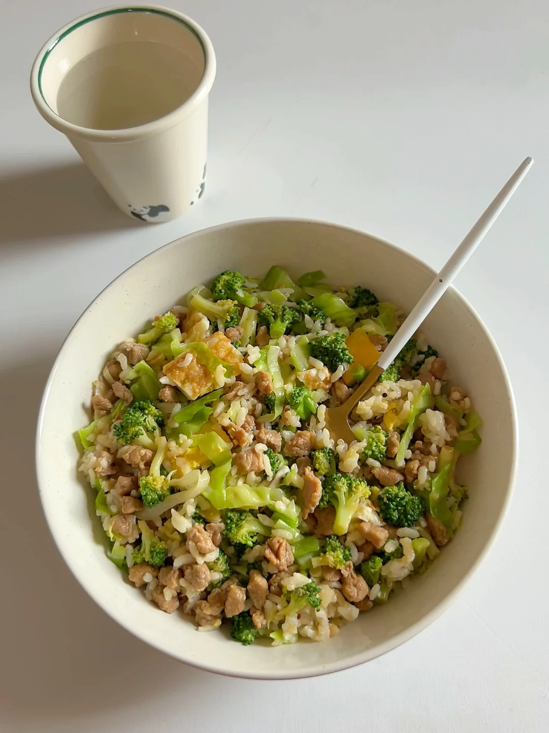 今天吃的是西兰花炒肉粒➕包菜丝➕煎蛋