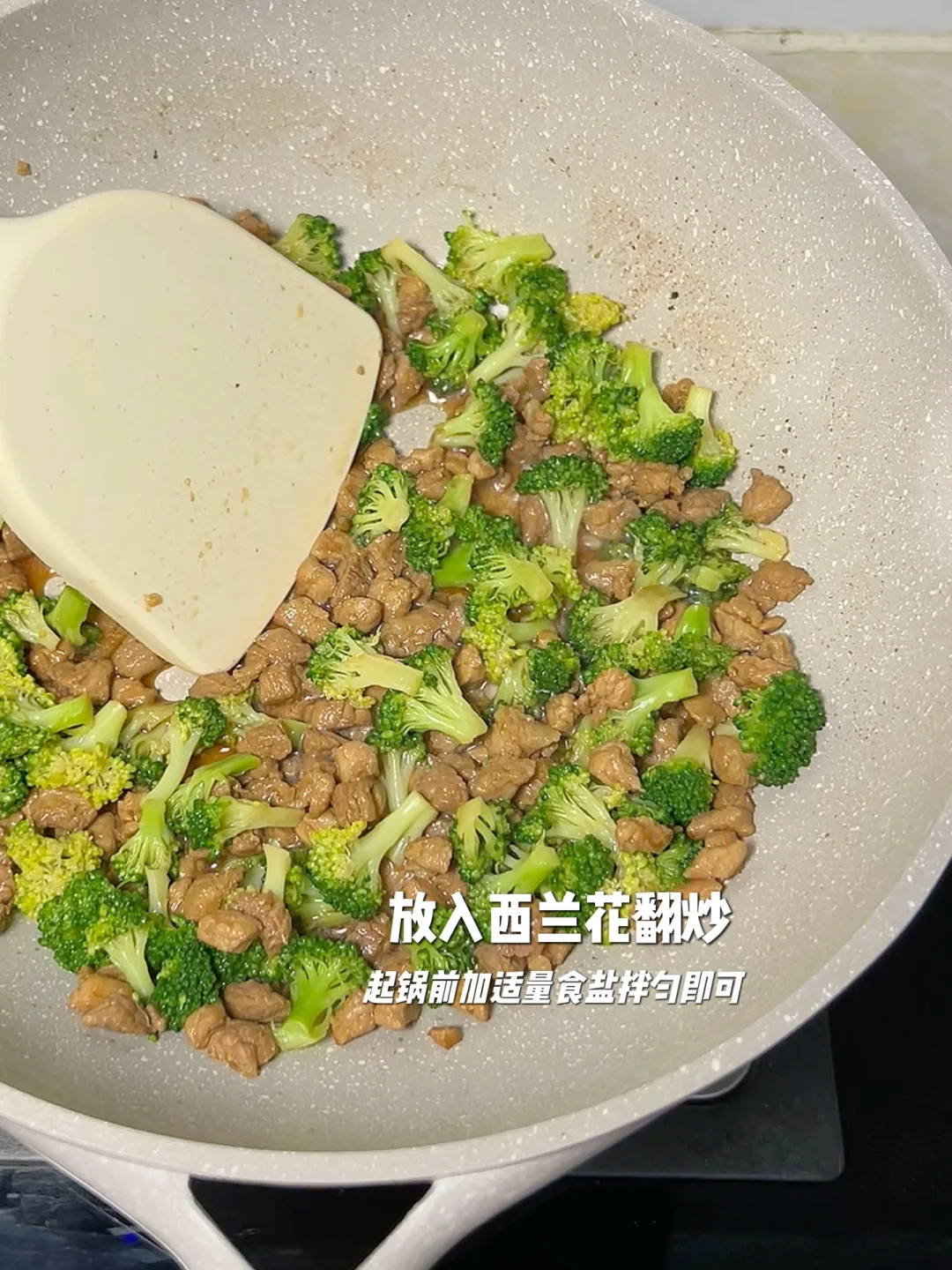 2⃣️ 少油,下入腌好的猪肉/牛肉粒,炒至快熟,然后放入西兰花继续翻炒,起锅前加少许食盐拌匀即可;
