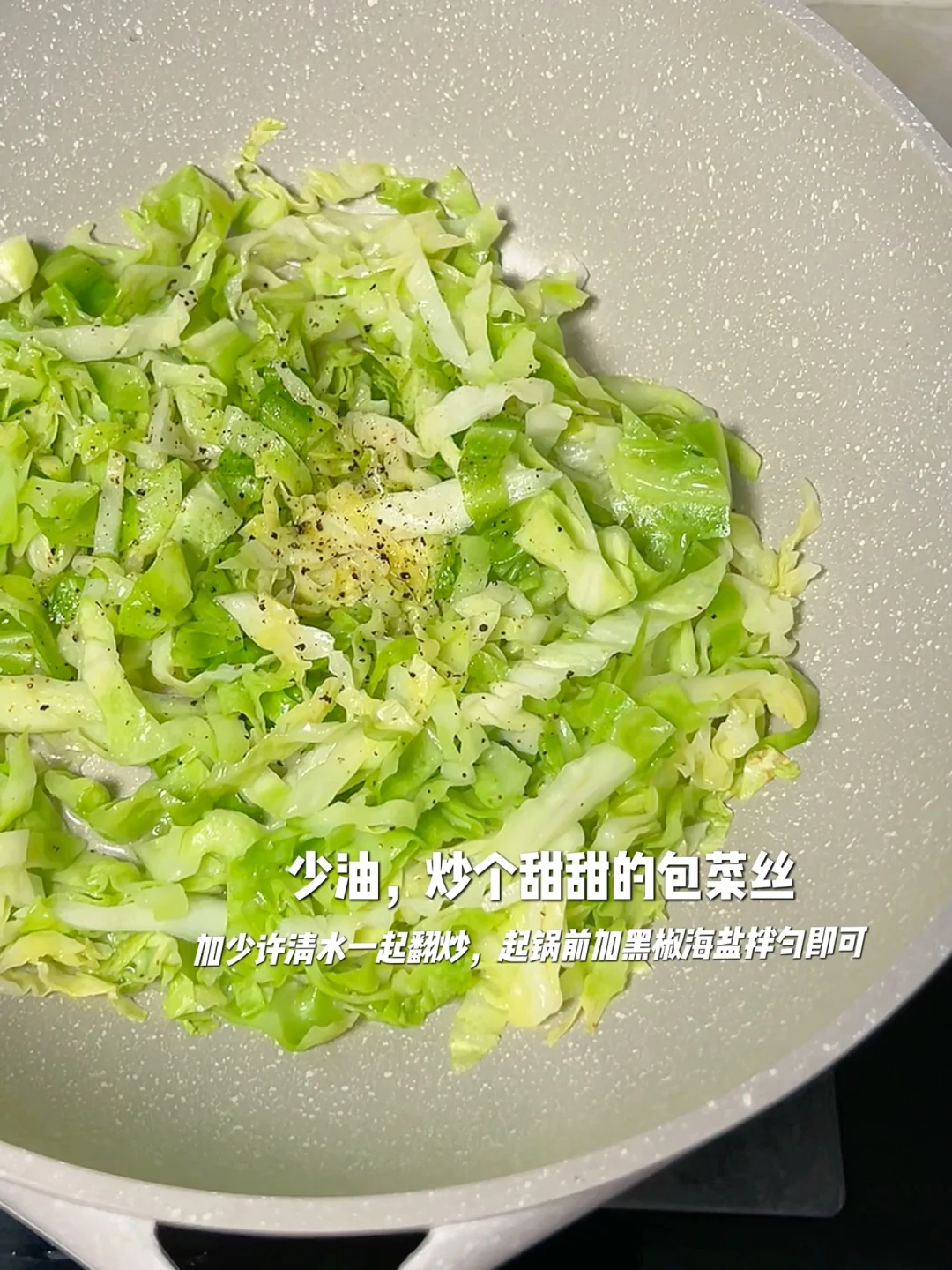3⃣️ 少油,放入包菜丝炒软,起锅前加适量黑椒海盐拌匀即可;
